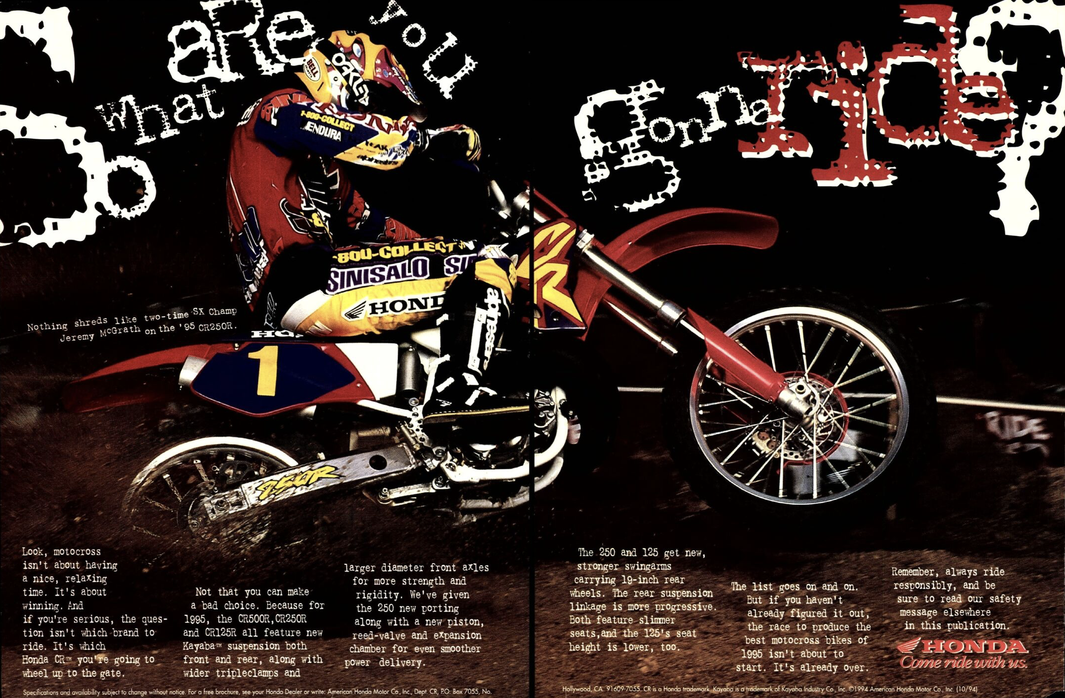 One other note on McGrath in 1994. This was the year that he introduced his signature nac-nac trick, a move that grew out of his upbringing as a BMX rider. McGrath first did it in practice at the ’94 Orlando SX, which led to a what-the-hell-did-I-just-see?! moment in the grandstands. He also did it in the heat race, but not the main event as Mike LaRocco was too close behind him. One week later the photographers were ready in the Houston Astrodome for Jeremy to show off his new trick on the way to yet another win and, ultimately, another AMA Supercross title. You can much more about the nac-nac in this deep-dive story by our colleague Brett Smith of We Went Fast.