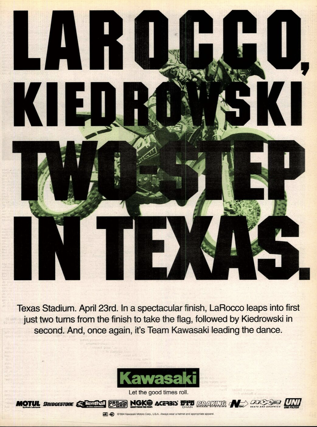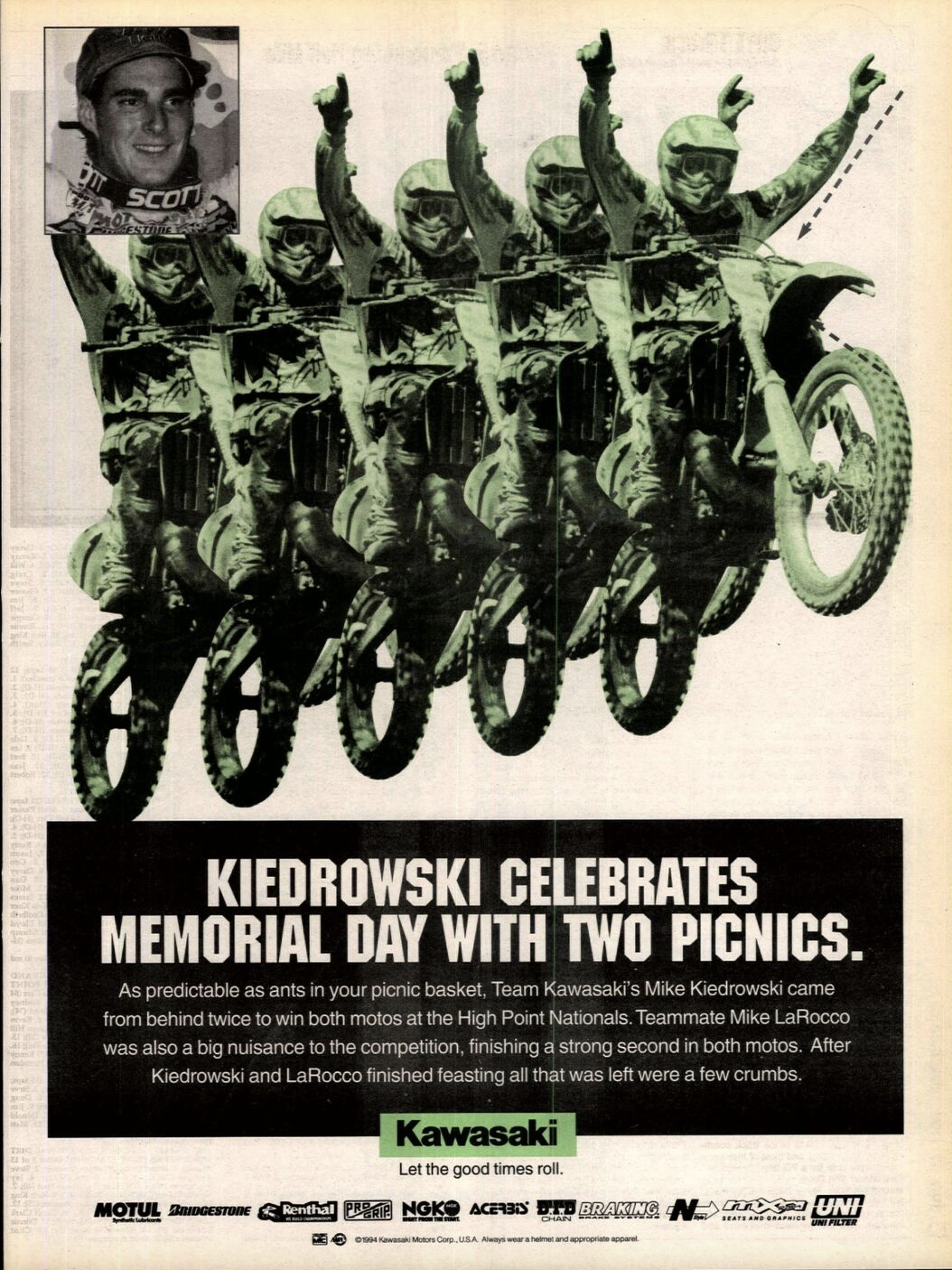 No doubt the most shocking thing to happen in 1994 came after the season. For the first time in 13 years, Team USA finally lost the FIM Motocross des Nations. The team of LaRocco on a 500 (the only time he would get to wear his #1 plate on the KX500 from the ’93 championship), a returning Kiedrowski on a 250, and Jeff Emig on a 125, simply got out-ridden by Team Great Britain, featuring Paul Malin, Kurt Nicoll, and Rob Herring. It was an all-time day for the Brits, especially Malin, who outperformed Emig and Stefan Everts to crush the 125 class. Great Britain has not won the Motocross of Nations since, but this shocking win was big enough to last a lifetime!