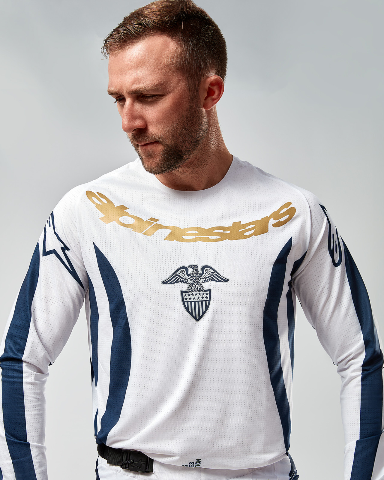The Dress Whites | Tropical design combines a unique military style and elegance with luxurious premium gold accents, logos, and Alpinestars wordmarks. A fitting tribute to Alpinestars’ world-renowned team of athletes, the combination of white, navy blue, and gold color accents has long been considered a visual representation of both courage and perseverance, two attributes these riders share heavily with the military heroes of this country.