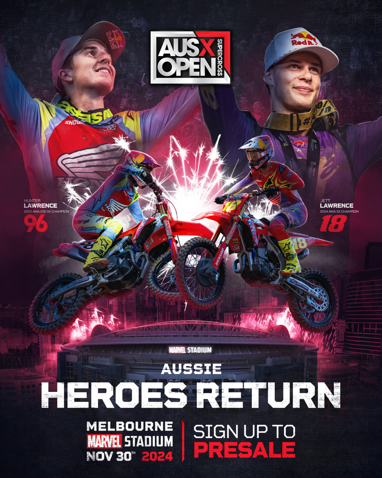World renowned Supercross stars and iconic Queensland brothers, Jett and Hunter Lawrence, have teamed up with an experienced Australian event promotion team to bring their favorite Australian event, the AUSX Open, back to Marvel Stadium on November 30.
