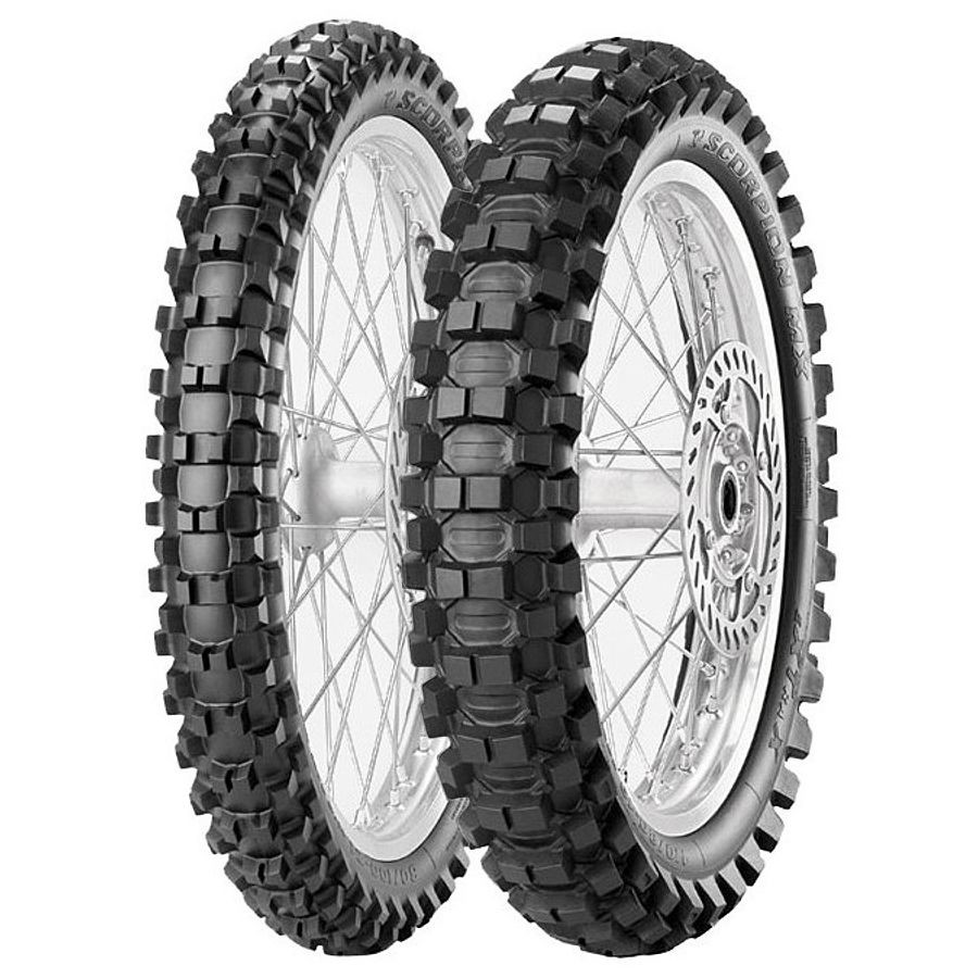 - Tread pattern taken from previous design with the rear's layout rigidity improved through "bridges" and a new front similar to the Scorpion MX Soft 410.