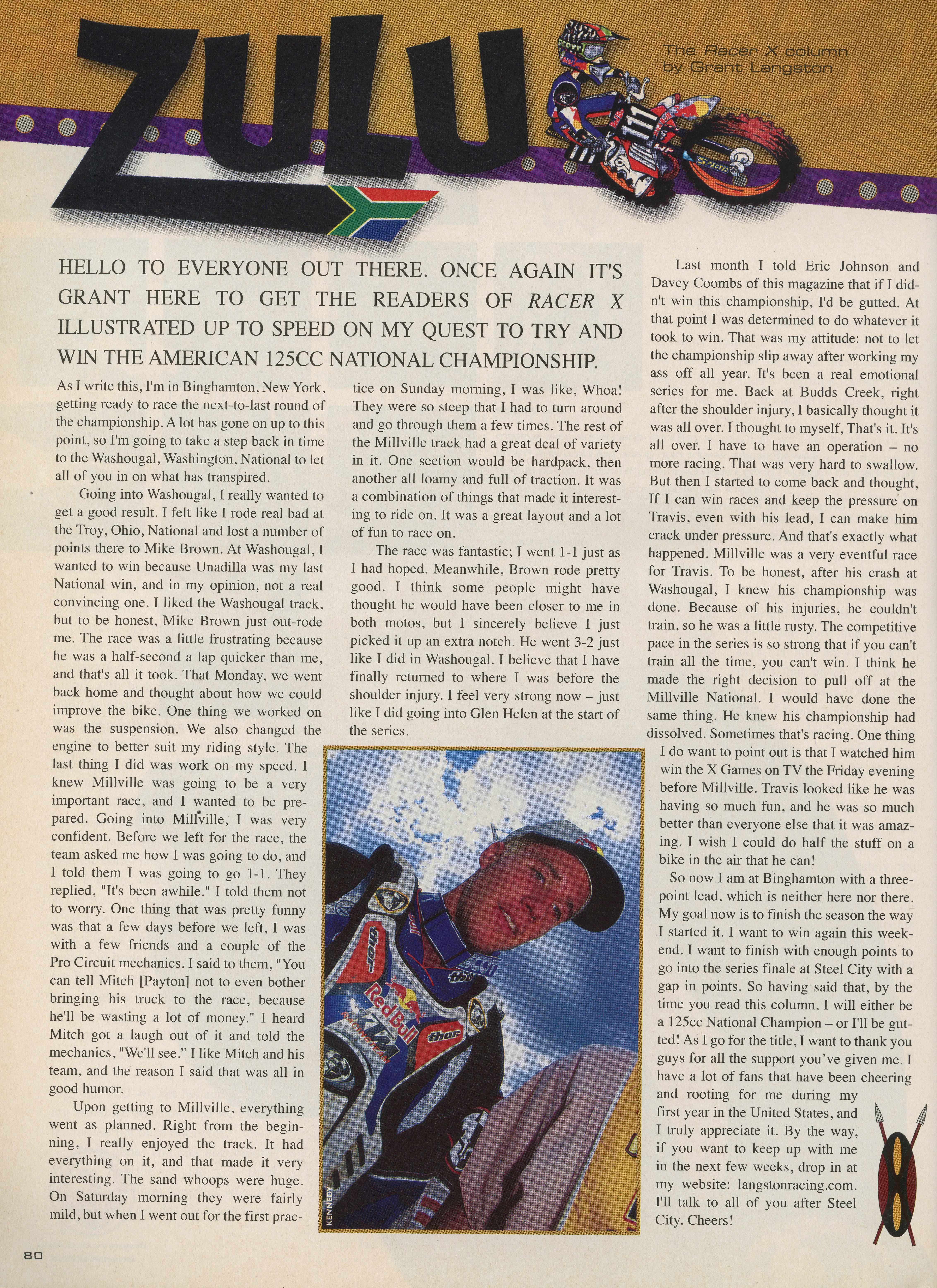 Before the 2001 season started, there were already harsh feelings between the riders. Grant Langston and Mike Brown had dueled in the press and on the track in the 2000 125 FIM Motocross World Championship and Travis Pastrana and Langston—well, let’s just say it went further back than that.