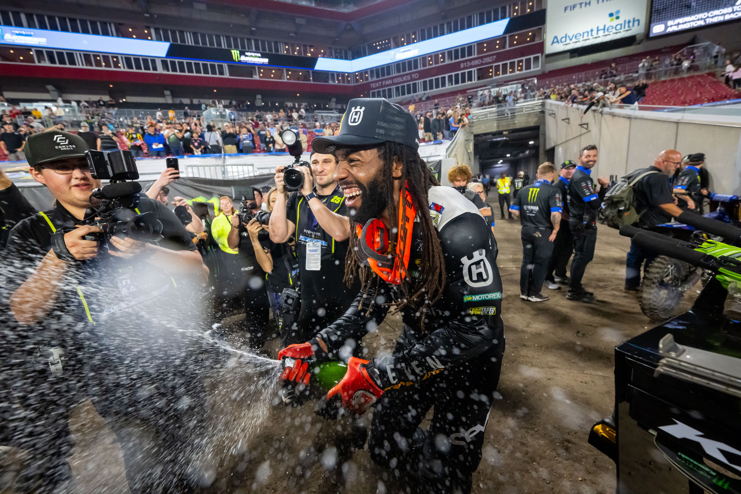 Malcolm Stewart: You know, it's kind of like an emotional roller coaster. Once I did my knee [injury] in 2023, you’re trying to rebuild yourself like this. I was so like upset with myself and people don't understand it's like when you have an injury like that, and you just think, who you should be, and you just can't figure it out. For a split second I was really upset with my myself: the team, everybody else was fighting. Everything was a big snowball effect and then I'm like my dad came to me and he sat me down and he was like, “Listen, either you either quit racing or go out there and just ride and have fun. Don't forget like why you did this and it's not because it's a paycheck it's because we had fun doing this, right?” Like I've done this my whole life. I live for this dream, this moment and fast forwarding to this now you know here we are, 2025. I'm like I had a really good offseason and I'm like the time is there if I'm gonna do it if I'm gonna ever be able to win a race, it's gonna happen [now] and I'm just so thankful for this opportunity to get this done, and in the home race! Like when fortunately when Chase went down, I come around in that same that sand turn and I couldn't hear my motorcycle anymore! The crowd was so loud! I know there's one person that that I wanna give this win to is my brother. He's been definitely been pushing me and pushing me and pushing me and I know he's probably just as proud of me as I'm proud of myself, so, I love you brother.