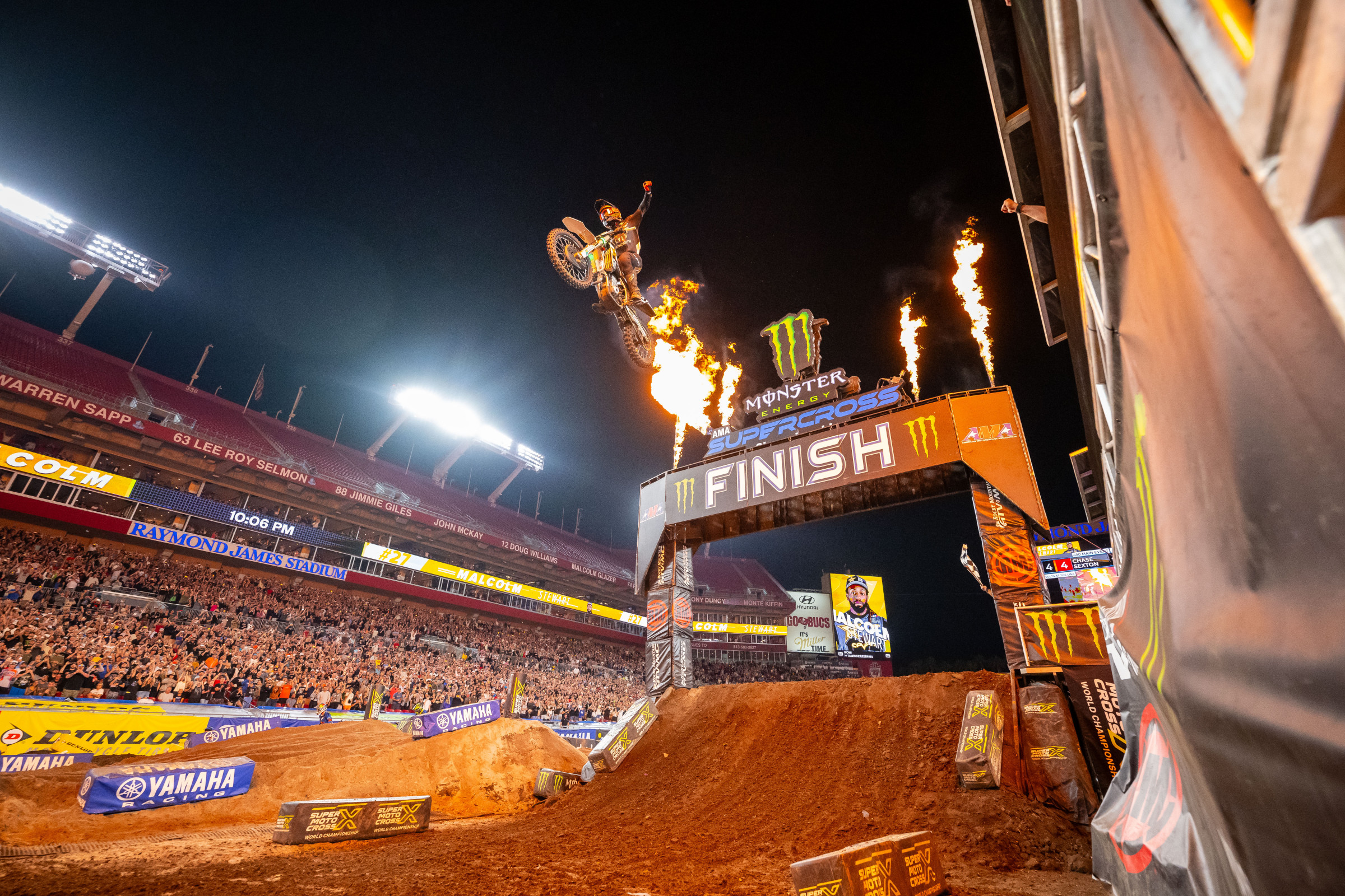 Malcolm Stewart wrote himself into the history books on Saturday with a big night in his home state of Florida. Stewart started inside the top ten and got to work, picking up position after position until he was in a podium spot. Then, he made a pass into second and started to run down championship leader Chase Sexton. When Sexton crashed at the end of the whoops section, Stewart flew by and into the race lead. Still, he had to get to the finish line. And after a handful of laps, he did just that!