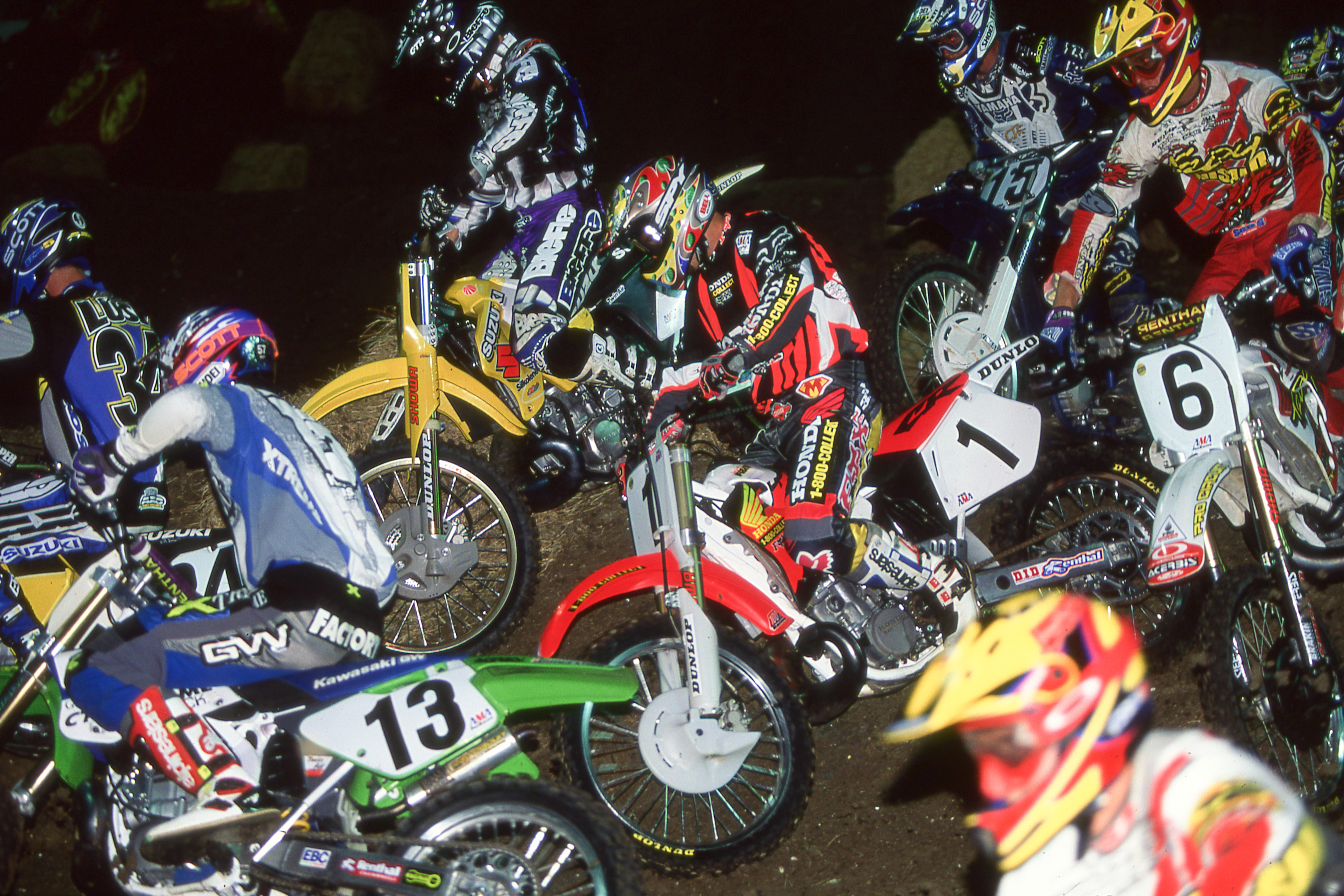 I had been a factory rider at Suzuki in ’95 but they dropped me so I got on the Great Western Bank Kawasaki team that Dave and Jim Castillo started. It was fun. I had my friends on it and I liked the Kawasaki. The week before the supercross opener, I won the Perris Invitational SX race. So I knew I was riding really well. I beat some good guys there.