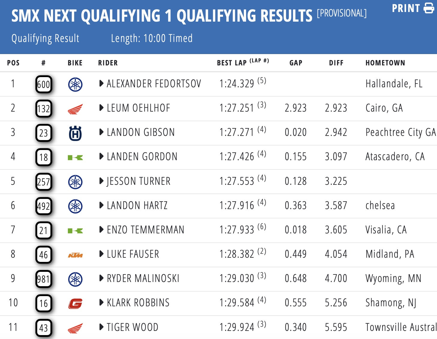 | 4 | Chandler Baker | 1:25.426 | Tulsa, OK | Husqvarna | ||