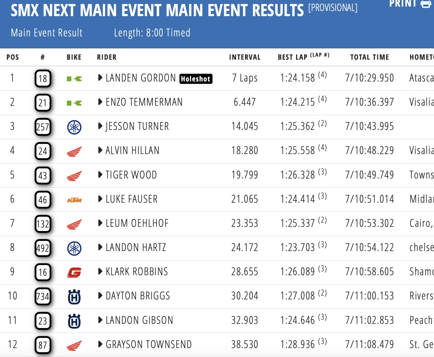 | 2 | Levi Kitchen | 1:19.809 | Washougal, WA | Kawasaki | ||
