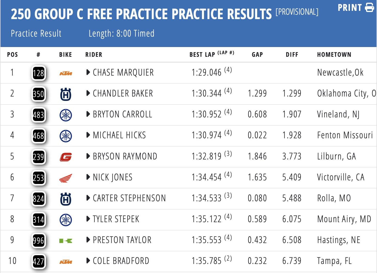 | 5 | Chase Sexton | 1:19.406 | La Moille, IL | KTM |