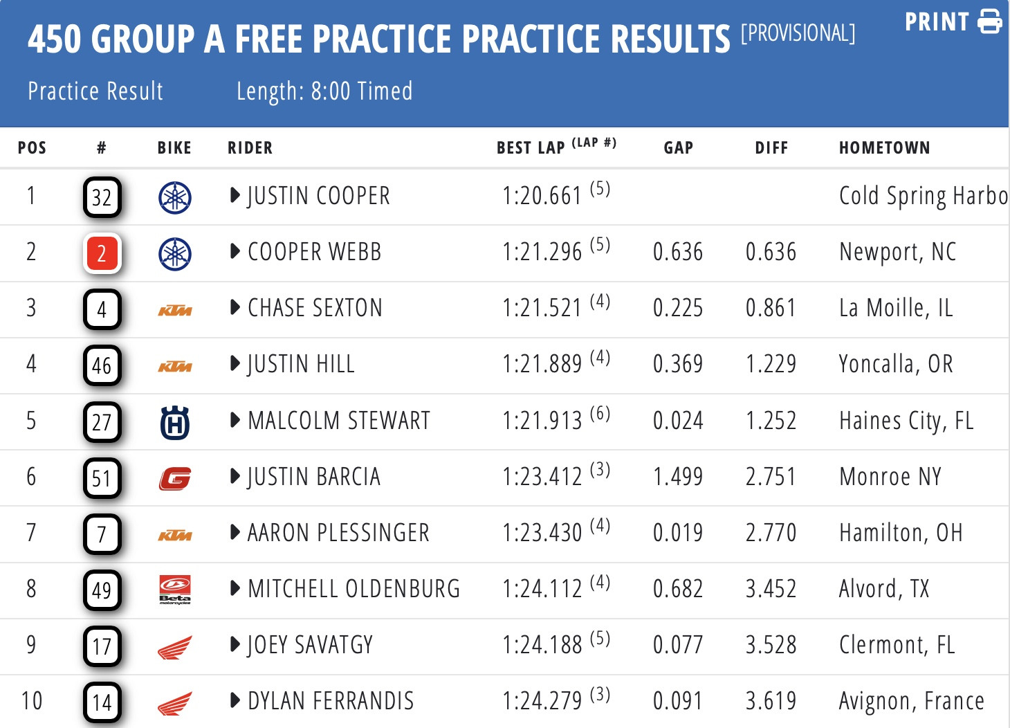 In 450 free practice, Justin Cooper came out swinging setting the fastest lap, the only rider to drop into the 1:20s with a 1:20.661, Cooper Webb was second fastest with a 1:21.296. Chase Sexton was third fastest with last week’s fastest qualifier, Justin Hill in third.