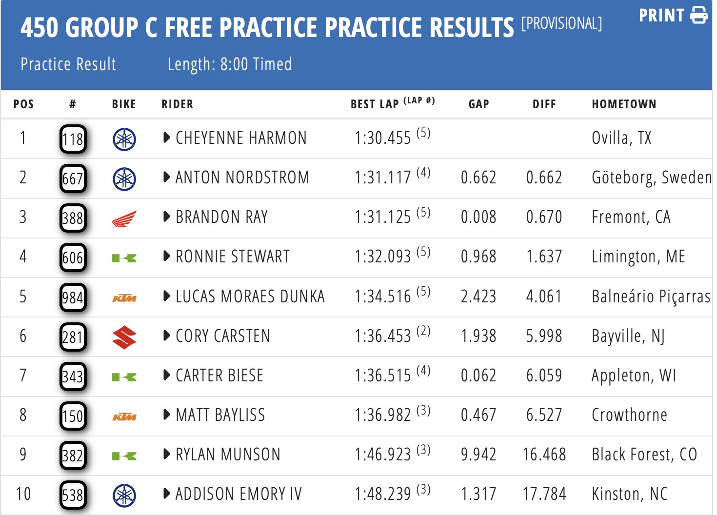 | 5 | Grant Harlan | 1:25.323 | Justin, TX | Yamaha |