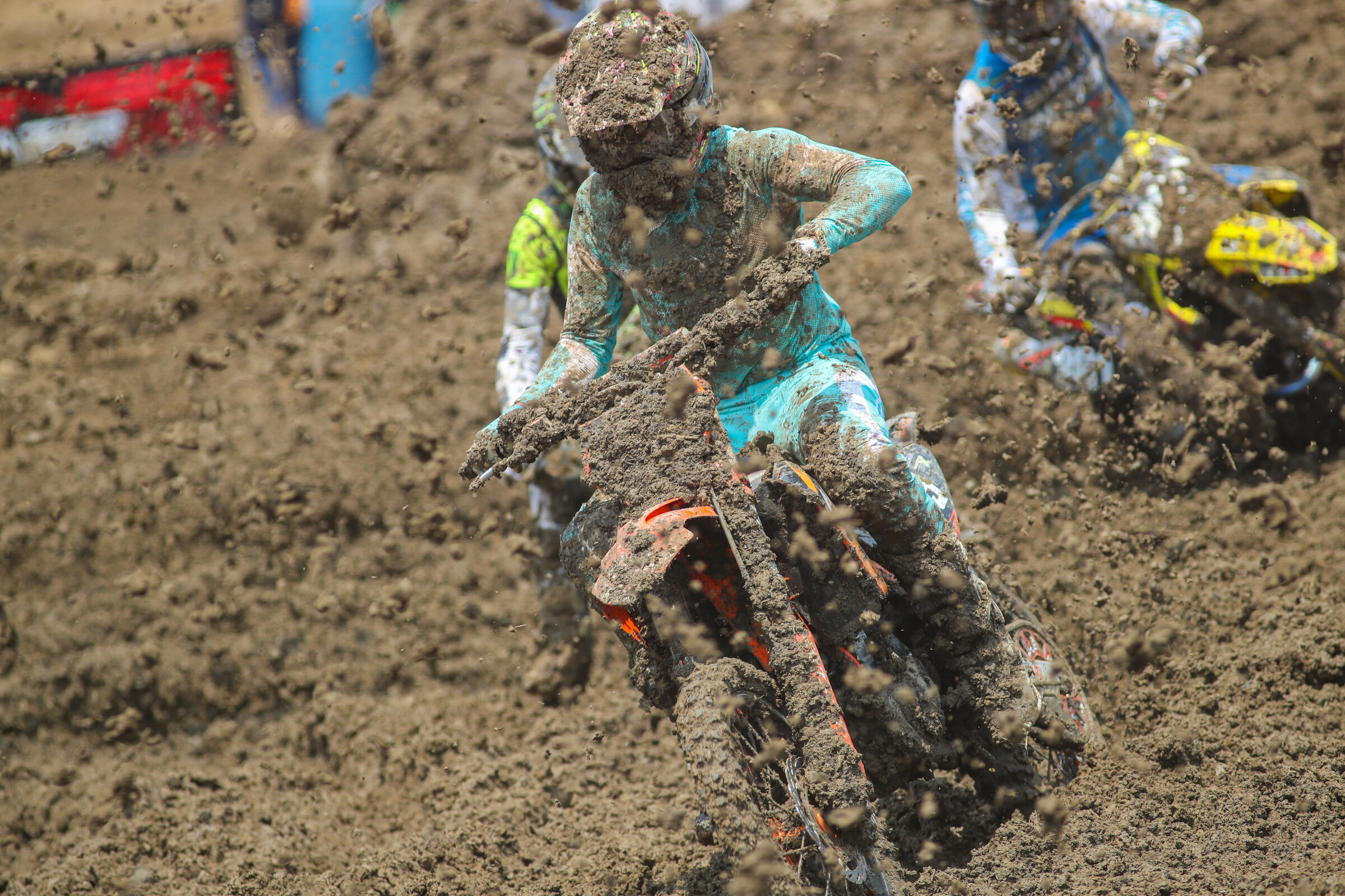 However, his day would unfortunately end quickly. In the first moto, he got off to a good start and was running inside the top 15. Covered completely in mud, he ripped tear offs and battled for positioning as he navigated both the riders and tricky track itself. But the conditions were tough on his machine—so tough, mud caked on and overheated his KTM 250 SX-F when the right radiator hose burst and caused his engine to overheat. Without a spare motor his day was over. A 39-DNS officially gave him 42nd overall.