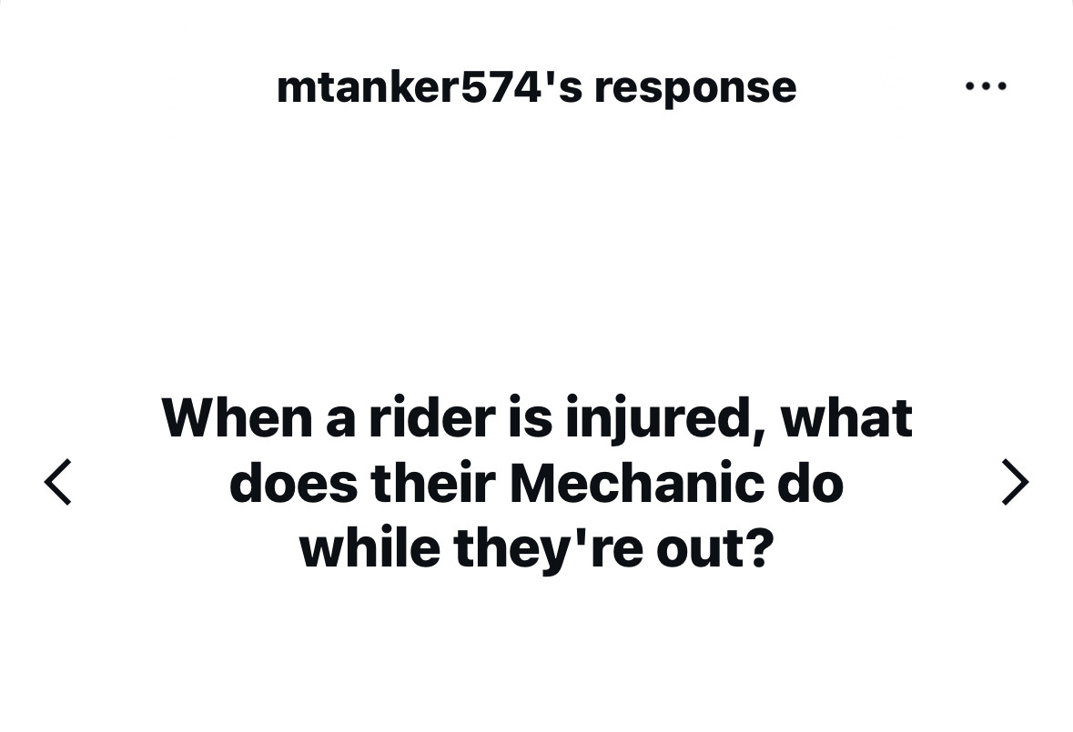 There’re plenty of things to do for a mechanic whose rider is hurt. You can become a test guy in the shop working on that side of things. You can go to the races and be a spare guy to help your other mechanics. When Tim Ferry was hurt at Yamaha, I turned into a Supermoto mechanic, which kind of sucked but also, I spent a ton of time on the dyno learning a lot in regard to what works in terms of HP and what doesn’t. Trust me, the work doesn’t stop.