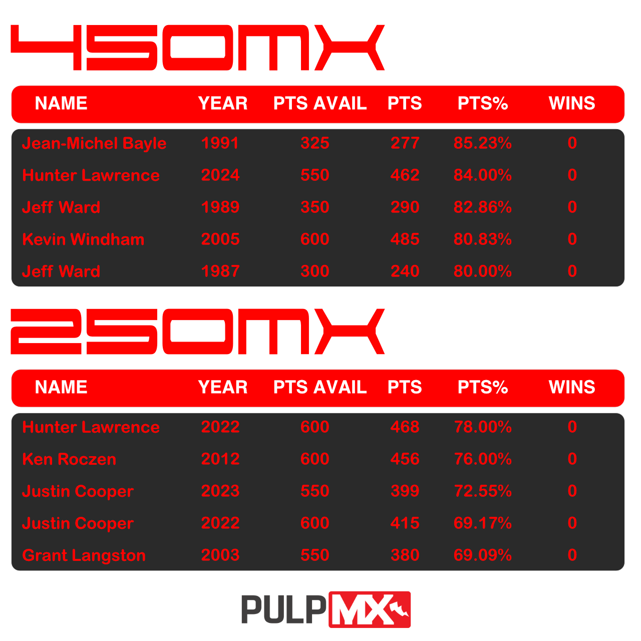 I posted this on social the other week, but Hunter Lawrence has scored the highest percentage of points in 250MX (2022) and the second most in 450MX (2024) without winning an overall. But first in the 450MX category is Jean-Michel Bayle in 1991, who won the title without winning an overall, but he won the title so who cares, right? So, Hunter Lawrence is basically the record holder (since 1985) of best rider without an overall in MX in BOTH classes! The more you know…