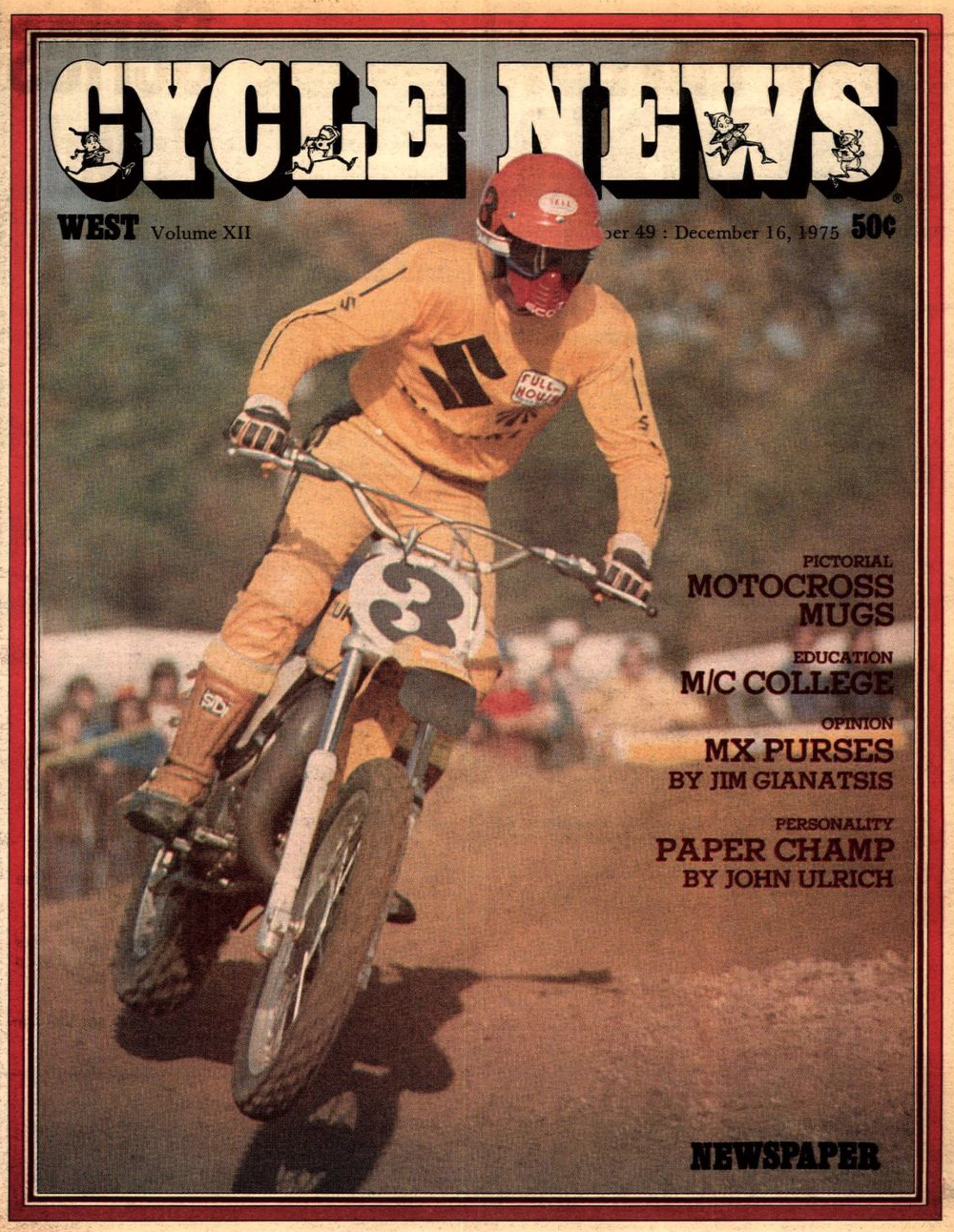 Tony DiStefano, the AMA's 250 National champion, lands on the cover of the December 16 Cycle News after winning three of the last four rounds of the 1975 Trans-AMA Championship Series and finishing third in the final rankings behind fellow Suzuki riders Roger DeCoster and Gerrit Wolsink.