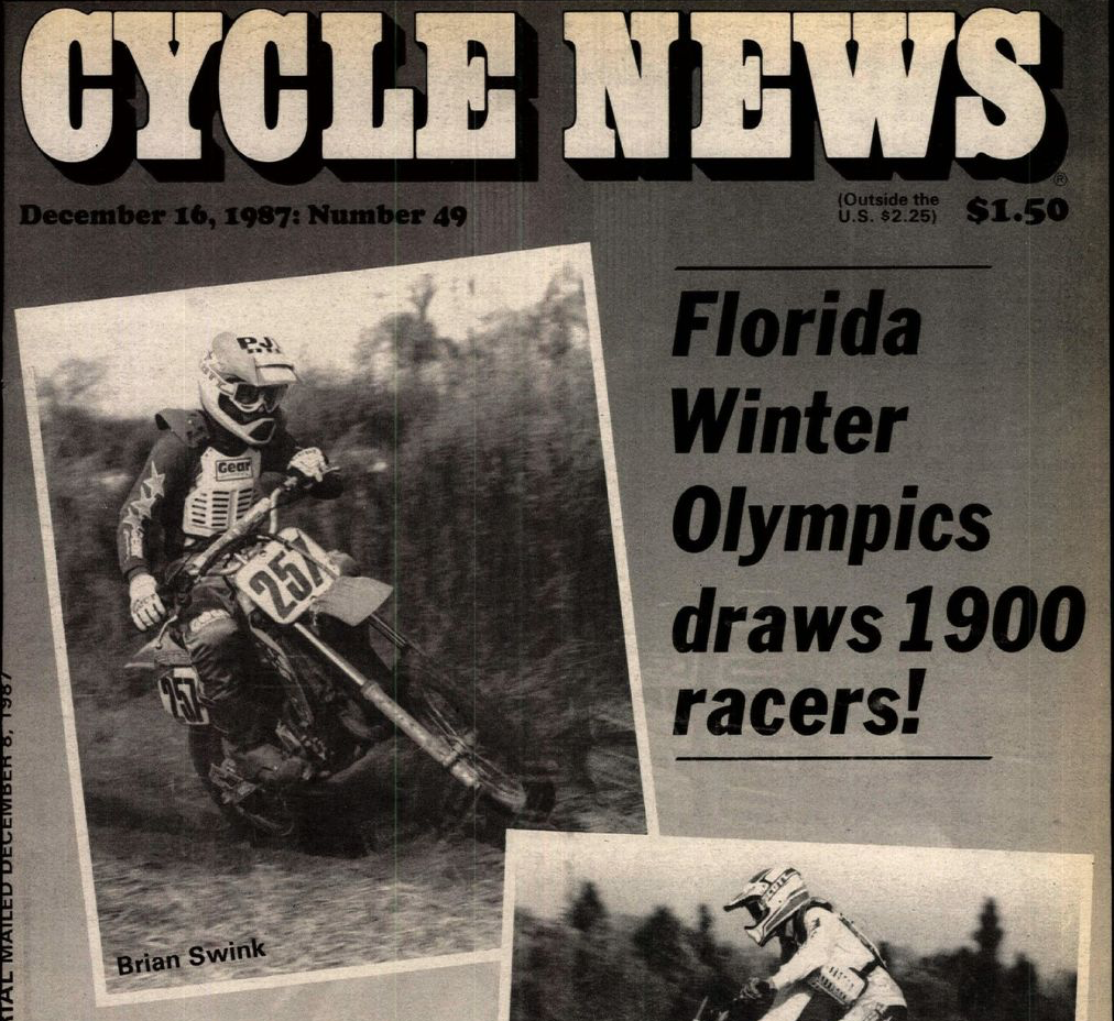 Kawasaki Team Green rider Brian Swink appears on the cover of the December 16, 1987, Cycle News, after a standout performance at the Winter Olympics at Gatorback Cycle Park in Gainesville, Florida.