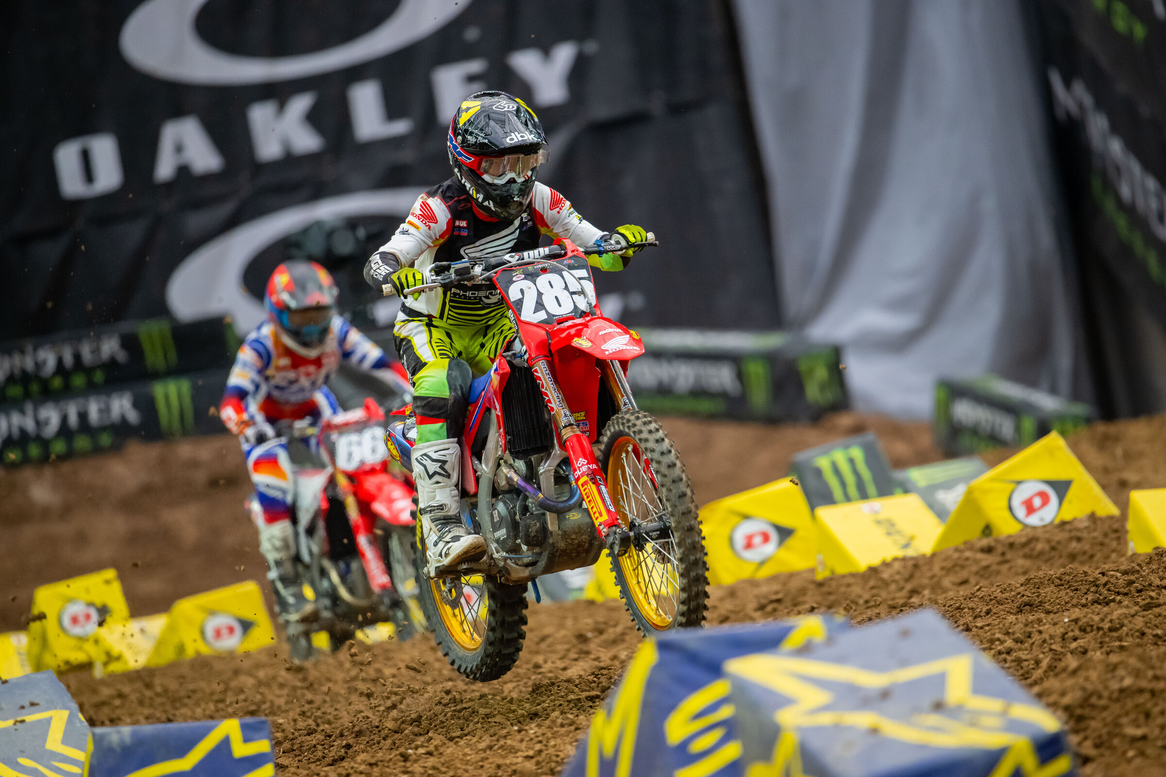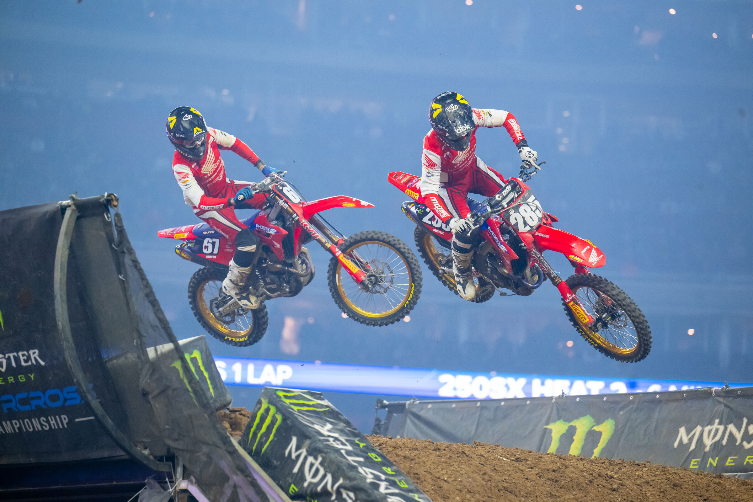 Phoenix Racing Honda’s Coty Schock went somewhat viral on Saturday night in Houston after a collision with his teammate Cullin Park over the finish line jump in the heat race saw Schock go flying into the side of the over-under bridge on the track. Amazingly, Schock was not only okay after the crash, he made the main event through the Last Chance Qualifier an hour later and finished an impressive 12th in the 250SX main event!