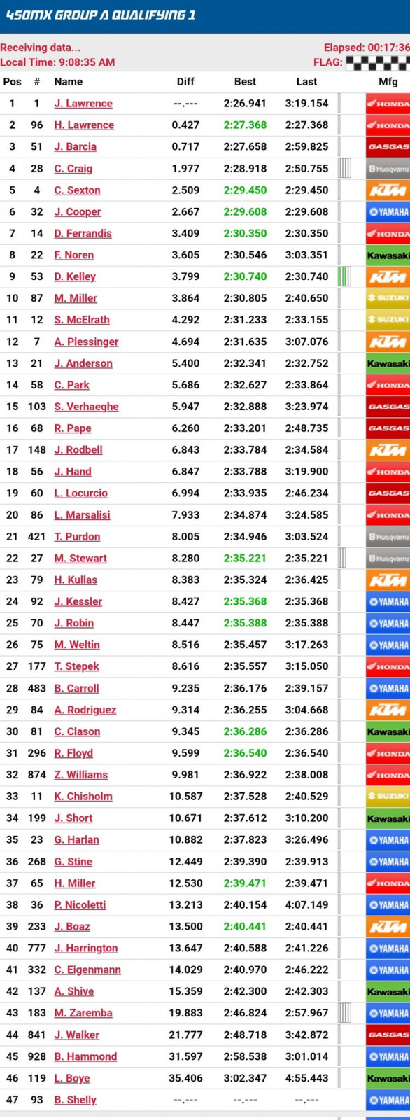 In the first 450 Class group A qualifying session, Justin Barcia led the field for most of the session until Jett and Hunter Lawrence both put down heaters late to move into the top two spots. Christian Craig was fourth-fastest as Chase Sexton rounded out the top five. Aaron Plessinger was 12th in the session.