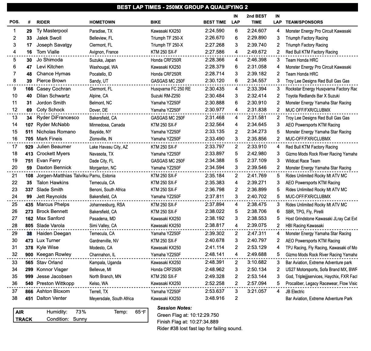 | 2 | Haiden Deegan | +0.387 | 2:10.695 | Temecula, CA | Yamaha YZ250F | |