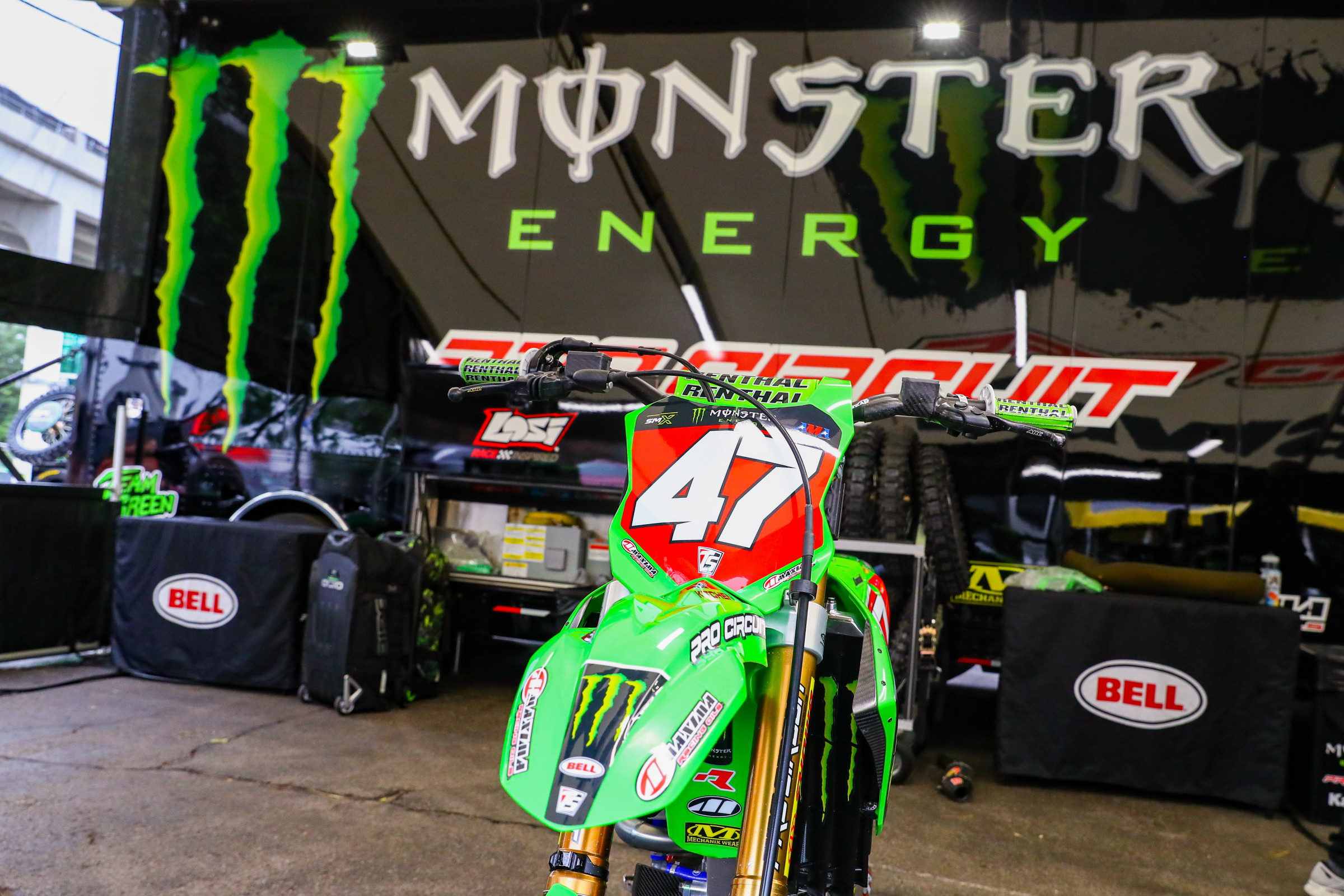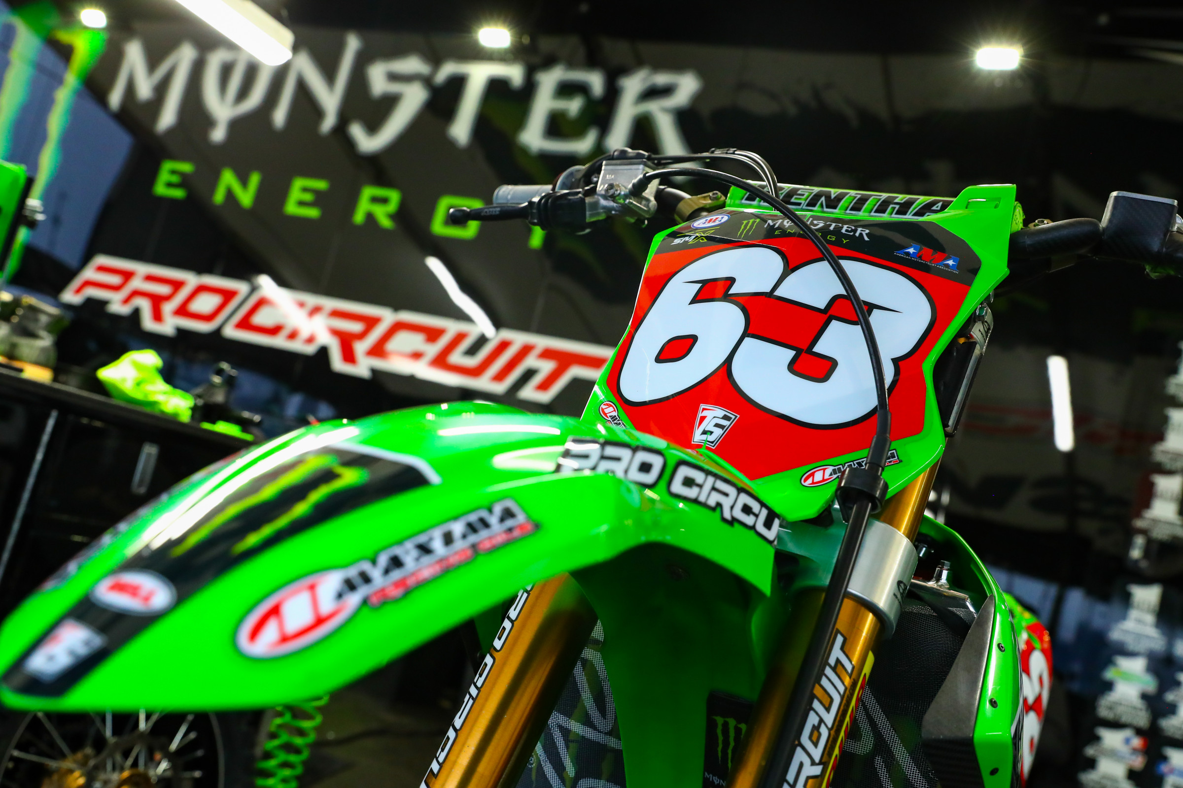 The first of two East/West Showdown events of the 2024 supercross season brings both Monster Energy/Pro Circuit Kawasaki points leaders—Levi Kitchen and Cameron McAdoo—together for the first time on the same weekend. Kitchen has a 15-point lead over RJ Hampshire and a 26-point lead over Jordon Smith in the 250SX West Region Championship as McAdoo has a four-point lead over Tom Vialle and a 13-point lead over Haiden Deegan in the 250SX East Region Championship. But throw in a handful of top riders and a dozen talented riders into the mix and today's points-paying main event could really make a significant swing either way in both championships. Unfortunately for Monster Energy/Pro Circuit Kawasaki, Kitchen and McAdoo are the only two healthy riders this weekend as Maximus Vohland, Austin Forkner, and now Seth Hammaker are all sidelined with respective injuries. Hammaker had a hard crash in the whoops, landing directly on his right shoulder, and despite rehabbing this week and trying to ride on Thursday, the #43 machine will not be able to race this weekend. He is hoping to return to racing next weekend at his home race, the Philadelphia Supercross.