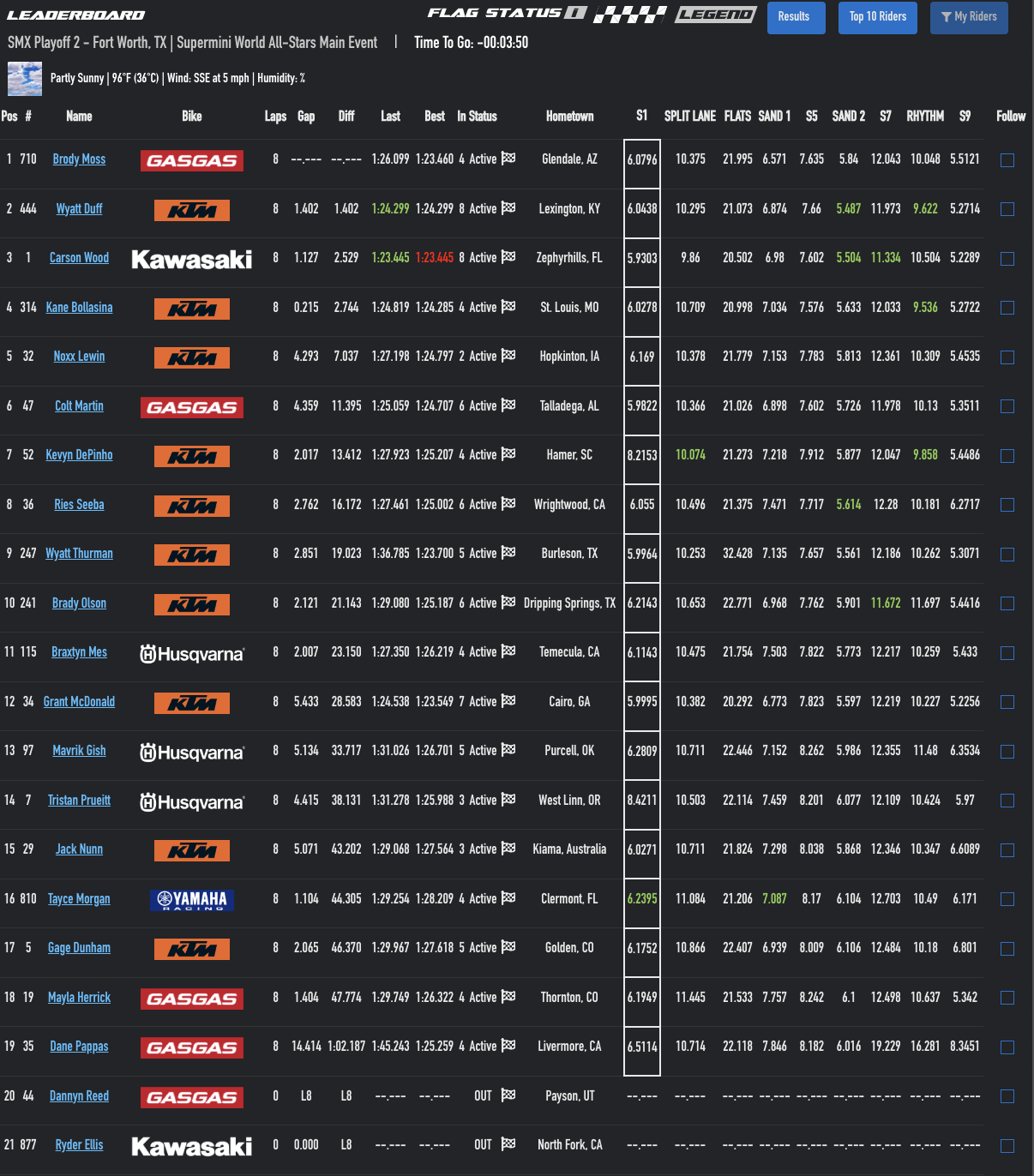 Ty Masterpool is familiar with this dirt, being Texas-based, and he logged a fast lap on his fifth lap to jump to the top, but Haiden Deegan and Julien Beaumer jumped up there on the seventh lap top take the first two spots. Deegan sitting with the fastest time is not a surprise but it’s interesting to see JuJu backing up his strong performance last week with another good run. He might be up at the front, permanently, now. Masterpool ended up third.