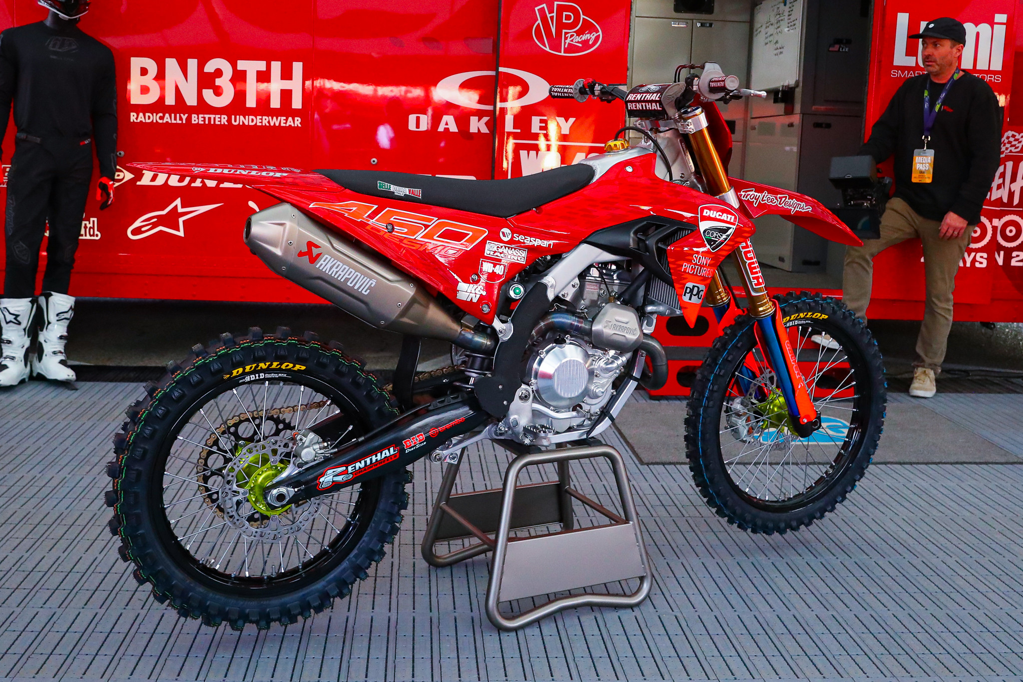 Next came the Ducati/Troy Lee Designs announcement and a beautiful Desmo450 MX motorcycle was unveiled that Troy Lee had designed himself. The goal is to have enough bikes produced and in America for early homologation, because they want Cairoli to race it, possibly as soon as RedBud in July! Needless to say, there was a lot of buzz under the TLD tent, especially with the announcement that Factory Connection boss Rick “Ziggy” Zielfelder will be part of the U.S. development.