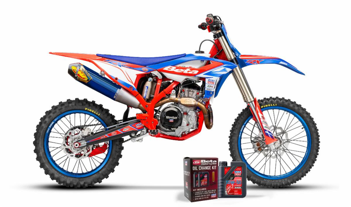 The winning bidder will receive: A 2024 Beta 450 RX, FMF complete exhaust system, custom printed set of HBD graphics, signed Benny Bloss front number plate, two sets of Pirelli tires, four cases of Liqui Moly oil, and the Liqui Moly Beta Race Team Supercross Experience.