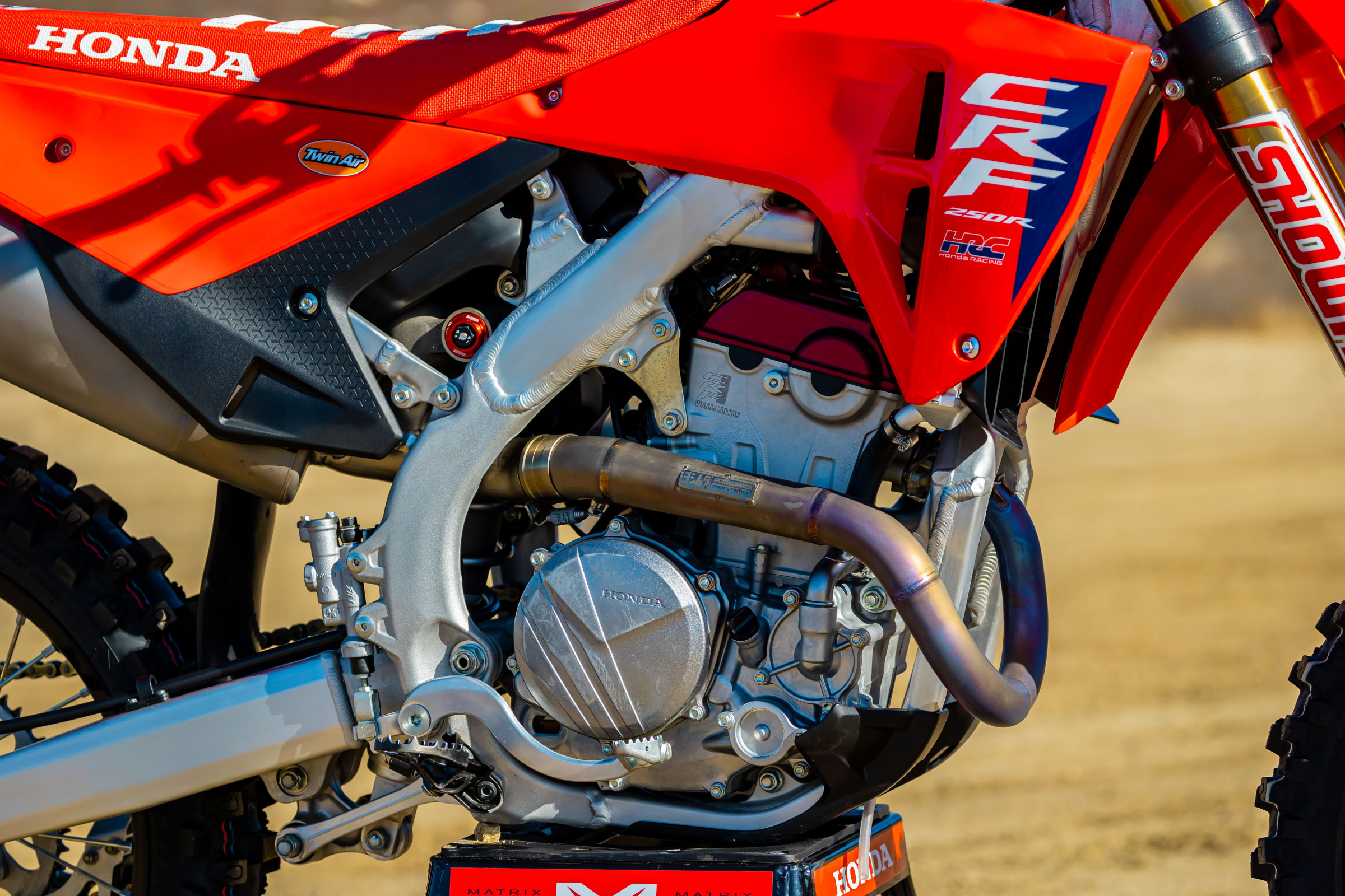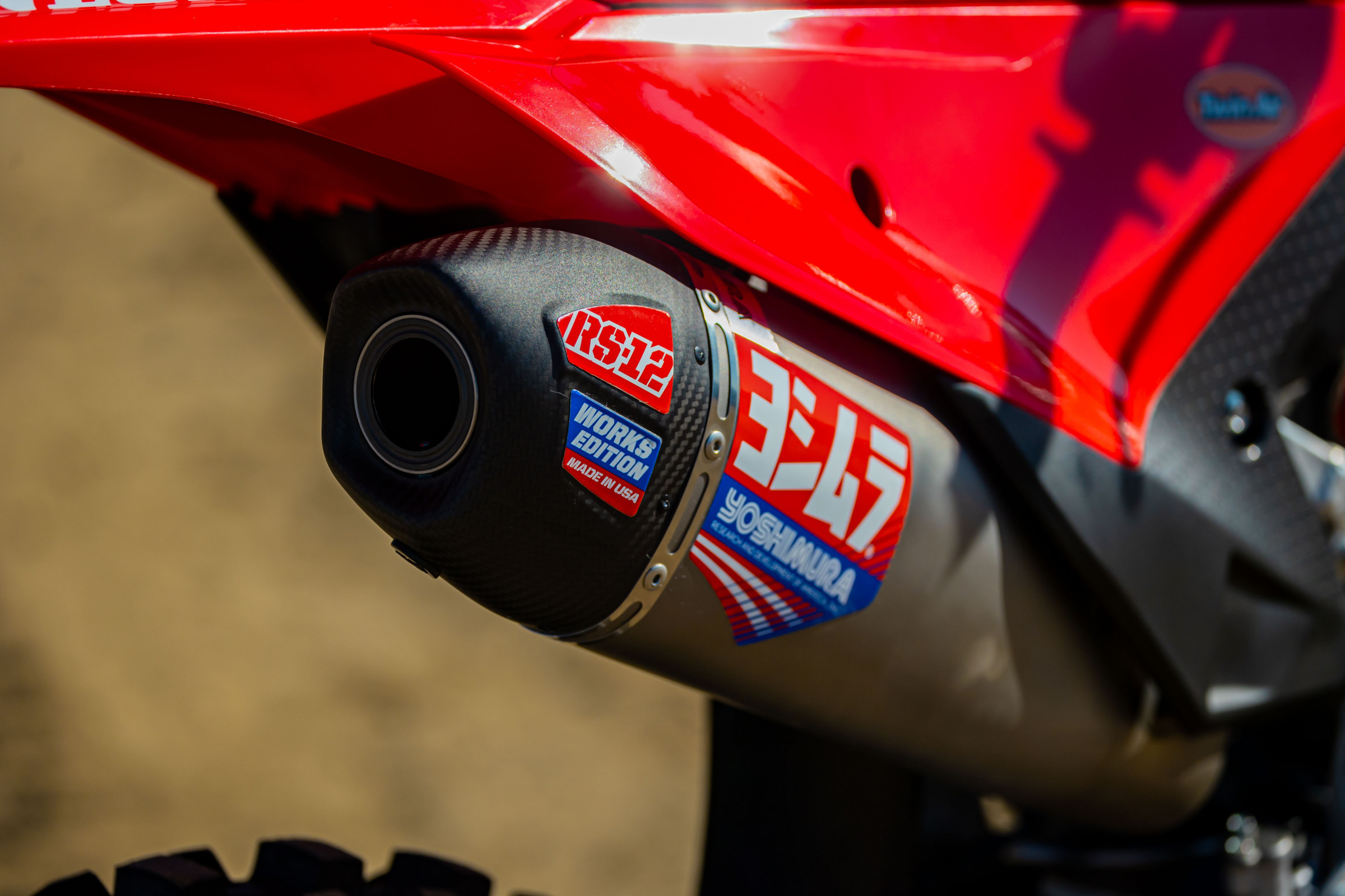 The CRF250R Works Edition comes with: Hydraulic Clutch. Yoshimura Exhaust. Twin Air Filter. Throttle Jockey Graphics. Red Cylinder Head Cover. Hand Polished Cylinder. DID LT-X Rims. Kashima-Coated Outer Fork Tubes. Titanium Oxide Coated Fork Legs. 18mm Shock Shaft. Hand-Operated Fork Combo Adjuster. DID DM2 Chain. Gray-Colored Triple Clamps. Renthal Kevlar Grips. Dedicated ECU Mapping. Dunlop MX33 Tires with 110 Rear Tire Sizing.