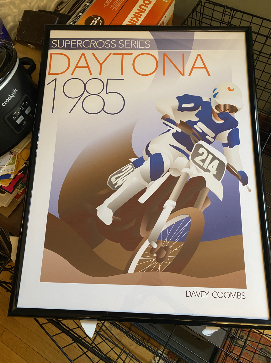 Here’s a proud dad moment: My son Vance is an aspiring graphic designer and student at West Virginia University, as well as an intern here with MX Sports/Racer Productions. For a Christmas present for me he took an old photo from the 1985 Daytona Supercross, my personal highwater mark in my brief career a pro rider, and made a cool poster out of it for my office. I was both surprised and blown away by how cool it looks. Thank you, Vance!