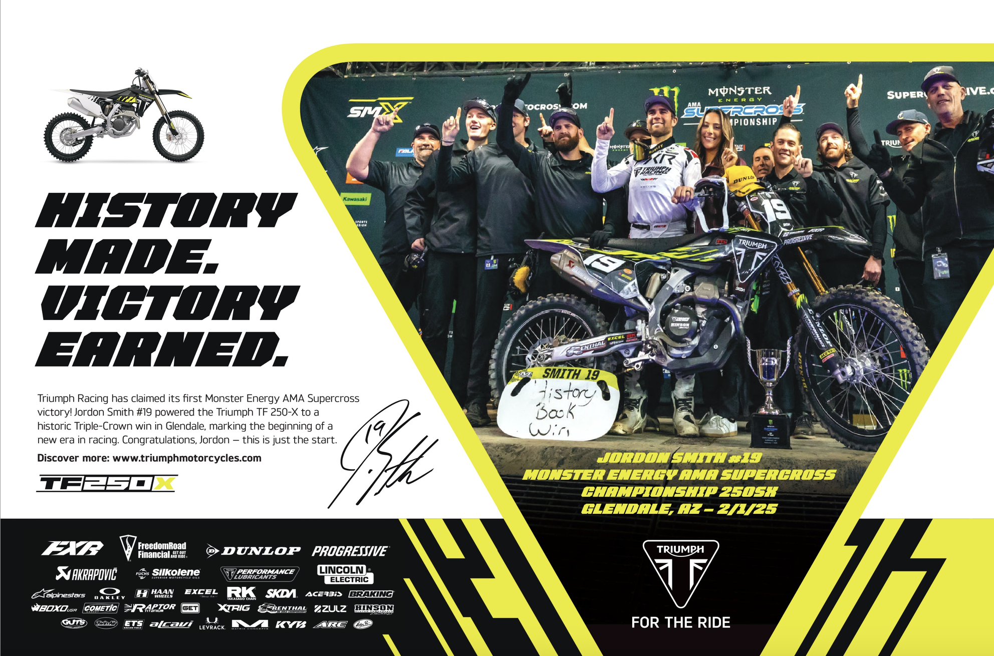 Was paging through the latest issue of Cycle News Magazine and spotted Triumph's historic first SMX win ad featuring Jordon Smith and the whole team on the podium at Glendale. For them to have earned this in less than one calendar year (363 days since their debut at Detroit '24) is amazing and impressive. Someone from Triumph asked me if that had ever been done before—a new brand to the sport winning a supercross within its first year—and, technically, I don't think it has. Then it was pointed out that Marty Tripes winning the Superbowl of Motocross in 1973, the first year that Honda participated on the AMA circuit with their new Elsinore CR250M. True, and impressive, but the '73 LA Coliseum race wasn't an official AMA Supercross, because the series didn't exist until 1974. The race Tripes won was considered part of the old Inter-Am Series run by Edison Dye. The first Honda to win an actual AMA Supercross did not happen until December 4, 1976, at the first official AMA Supercross at Angels Stadium in Anaheim, when Marty Smith took the win in what was the first race to feature single, winner-take-all main event format.
