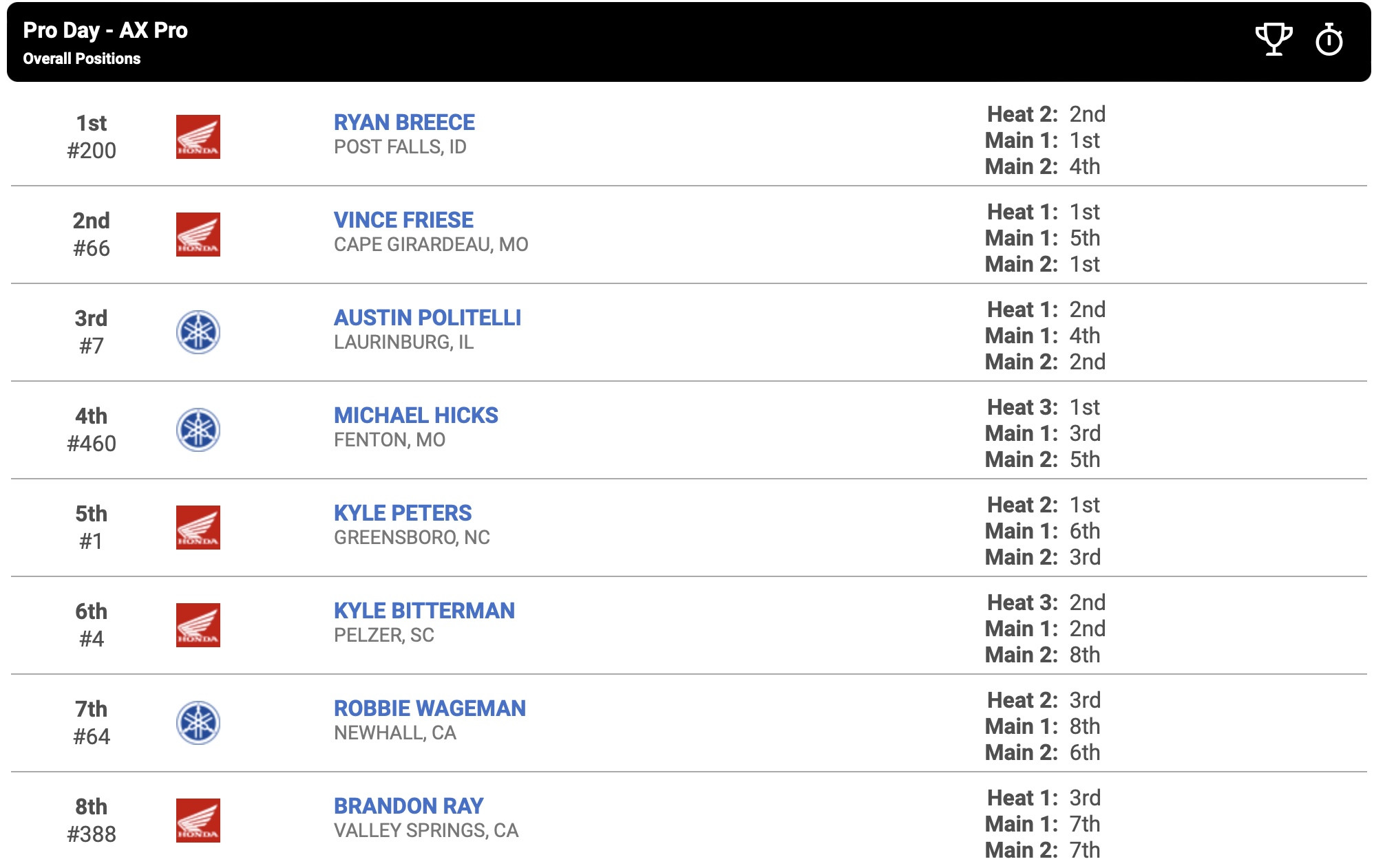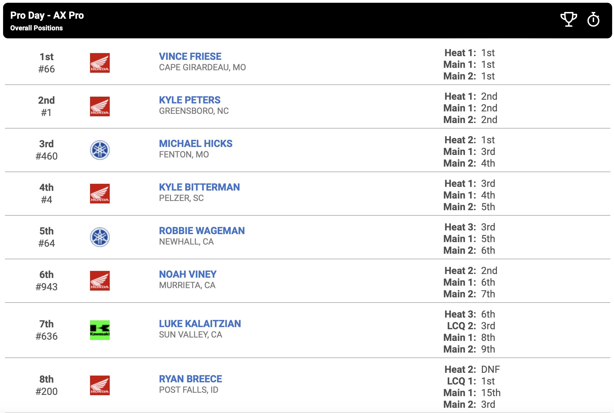 Friday night in Reno was one for the books. Vince Friese, who has a reputation for getting excellent starts, didn’t disappoint. He dominated the gates in all three motos, using his speed off the line to establish an early lead in each race. Friese’s consistency and tactical prowess allowed him to sweep the night with a flawless 1-1-1 performance, earning him the overall victory and sending a clear message to his rivals that he would be a contender throughout the season.