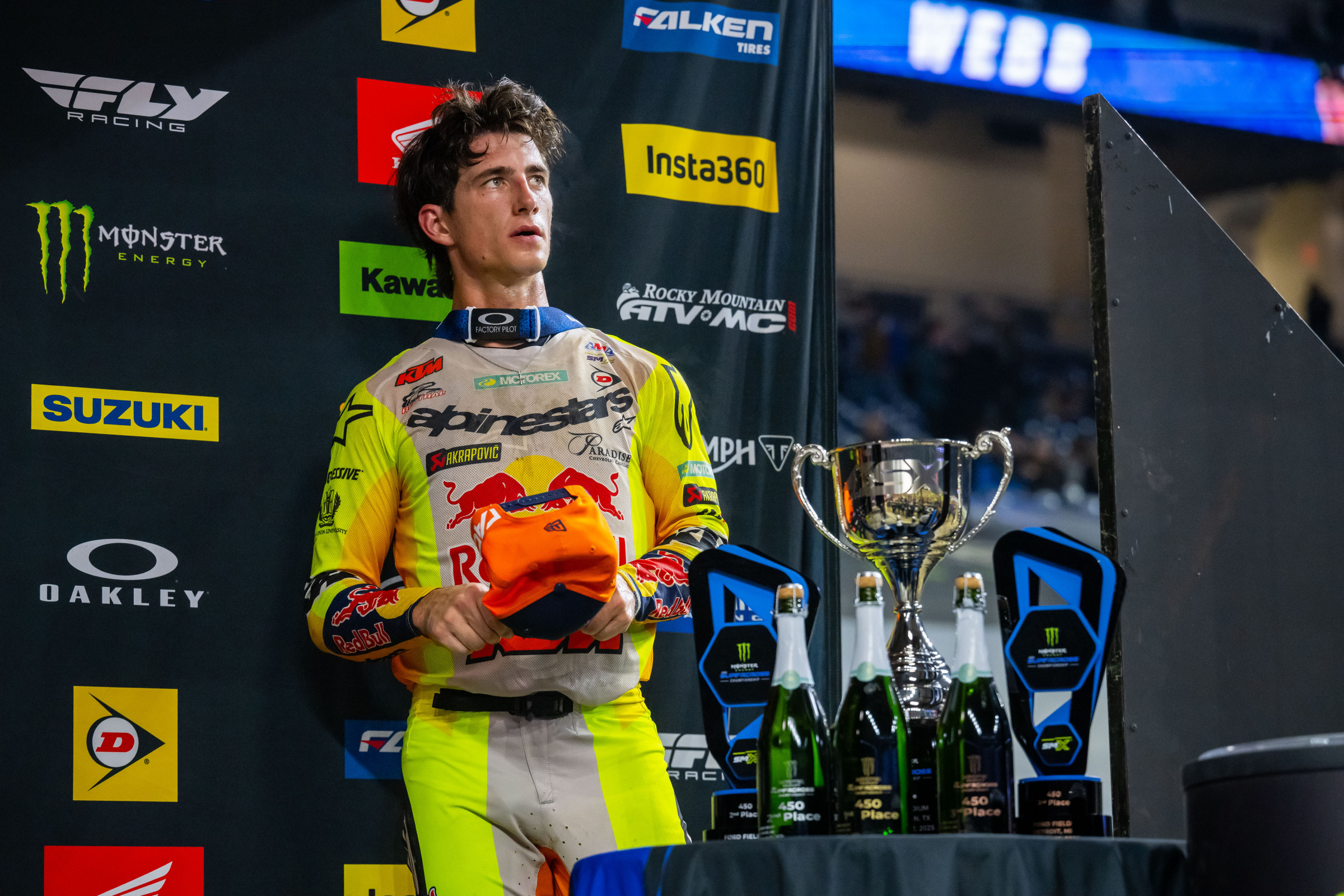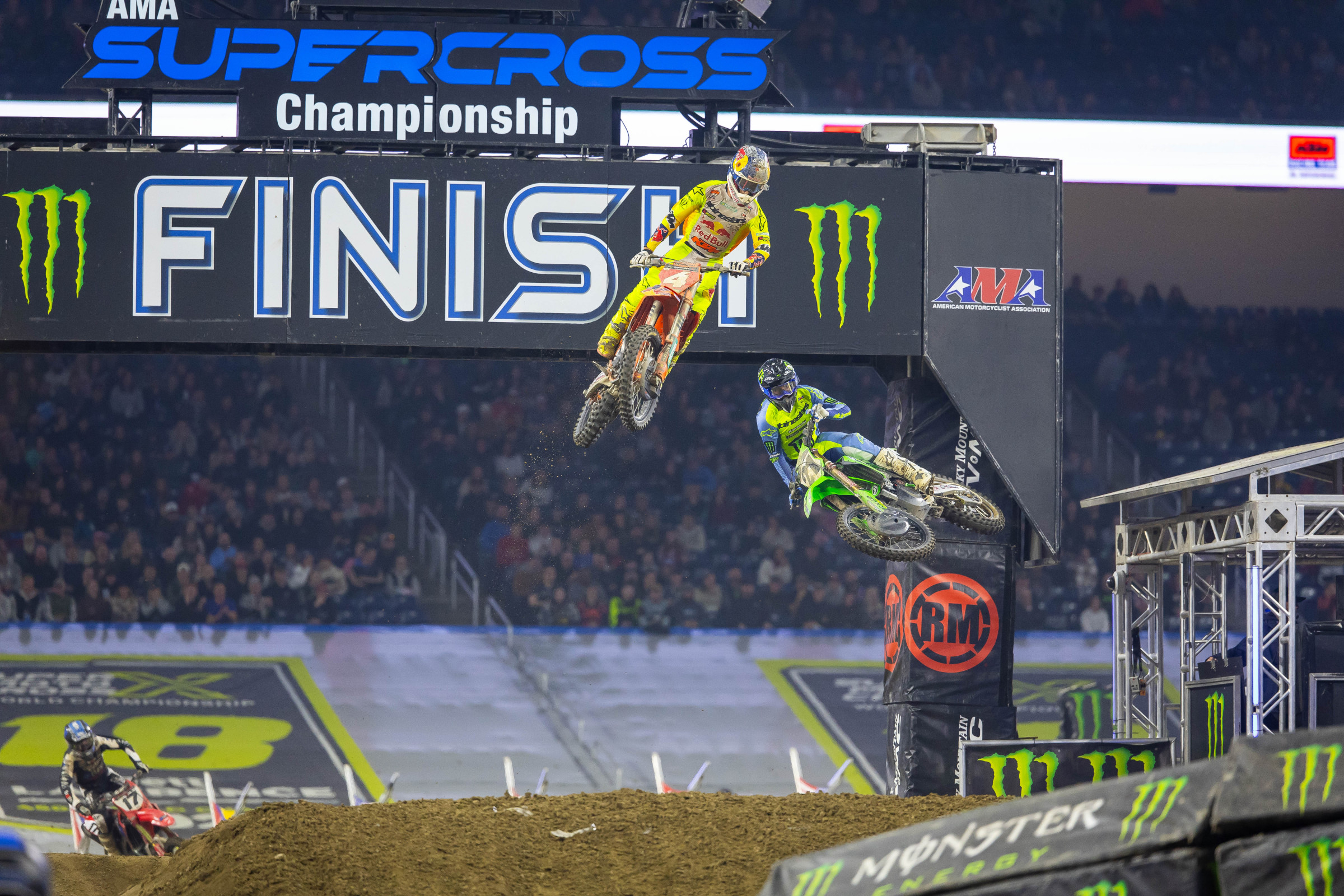 Chase Sexton went into the sixth round of Monster Energy Supercross with a five-point lead over Cooper Webb. However, after a rough first lap, where Sexton not only got stuck in the gate, but also went down a couple of corners later, he found himself having to work his way up from last. An impressive ride found him standing on the podium at the end of the night in third place, though he lost his five-point advantage over Webb, who made a late race pass on Ken Roczen for the win.