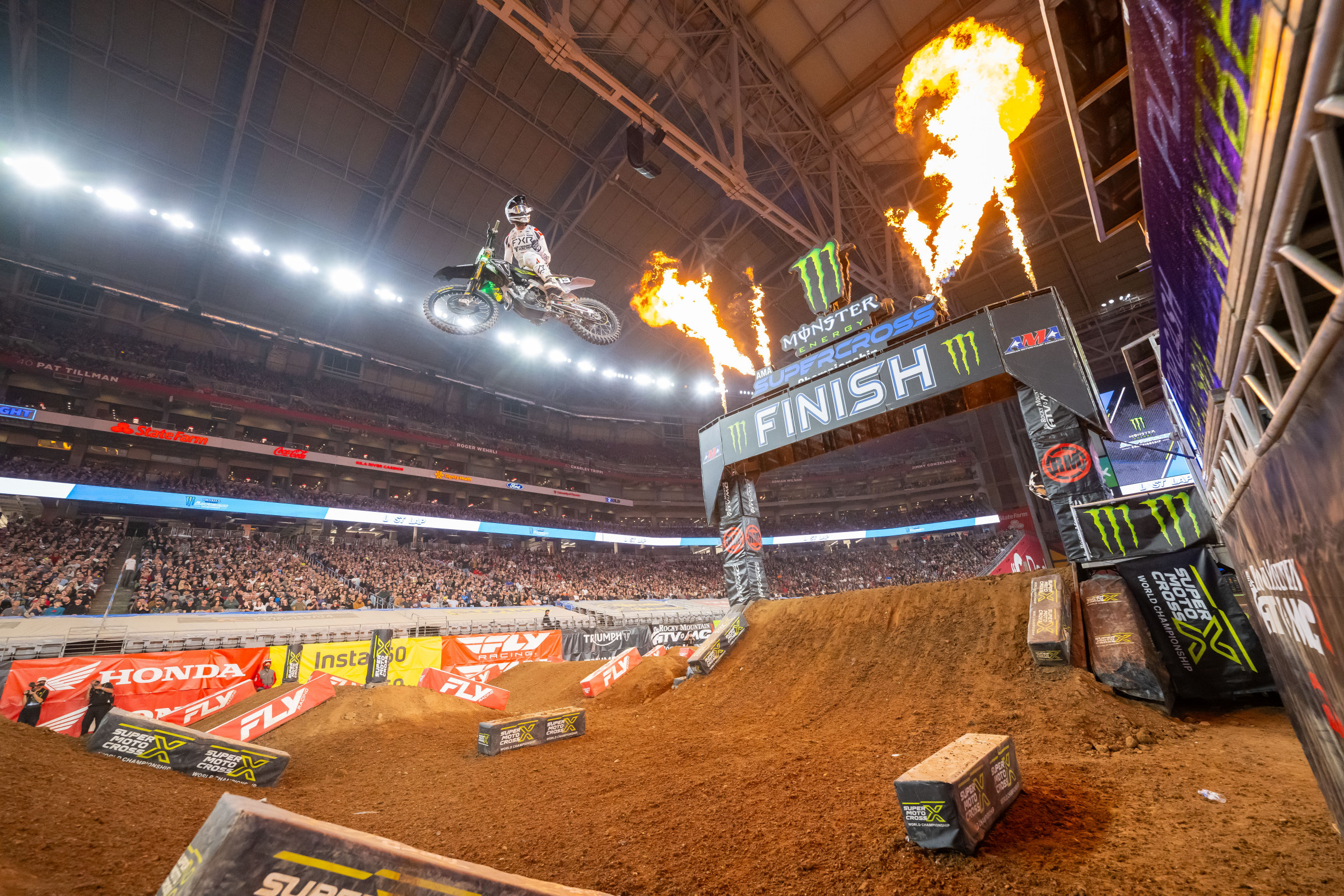 Jordon Smith took home a historic win in round four of the Monster Energy AMA Supercross 250SX West Region this weekend in Glendale. The win was the fifth of the 28-year-old’s career, but the first in the short AMA Motocross and Supercross history of Triumph Racing. It took the British motorcycle company just 13 attempts to land on the top step of an AMA Supercross event; a very impressive feat and certainly attests to the entire program and people involved in making come together. The win was also the first for Triumph’s team gear sponsor FXR! Certainly, a night to remember for Smith as he not only made history, but reestablished himself as a serious threat to this championship as the series takes a couple of weeks off.