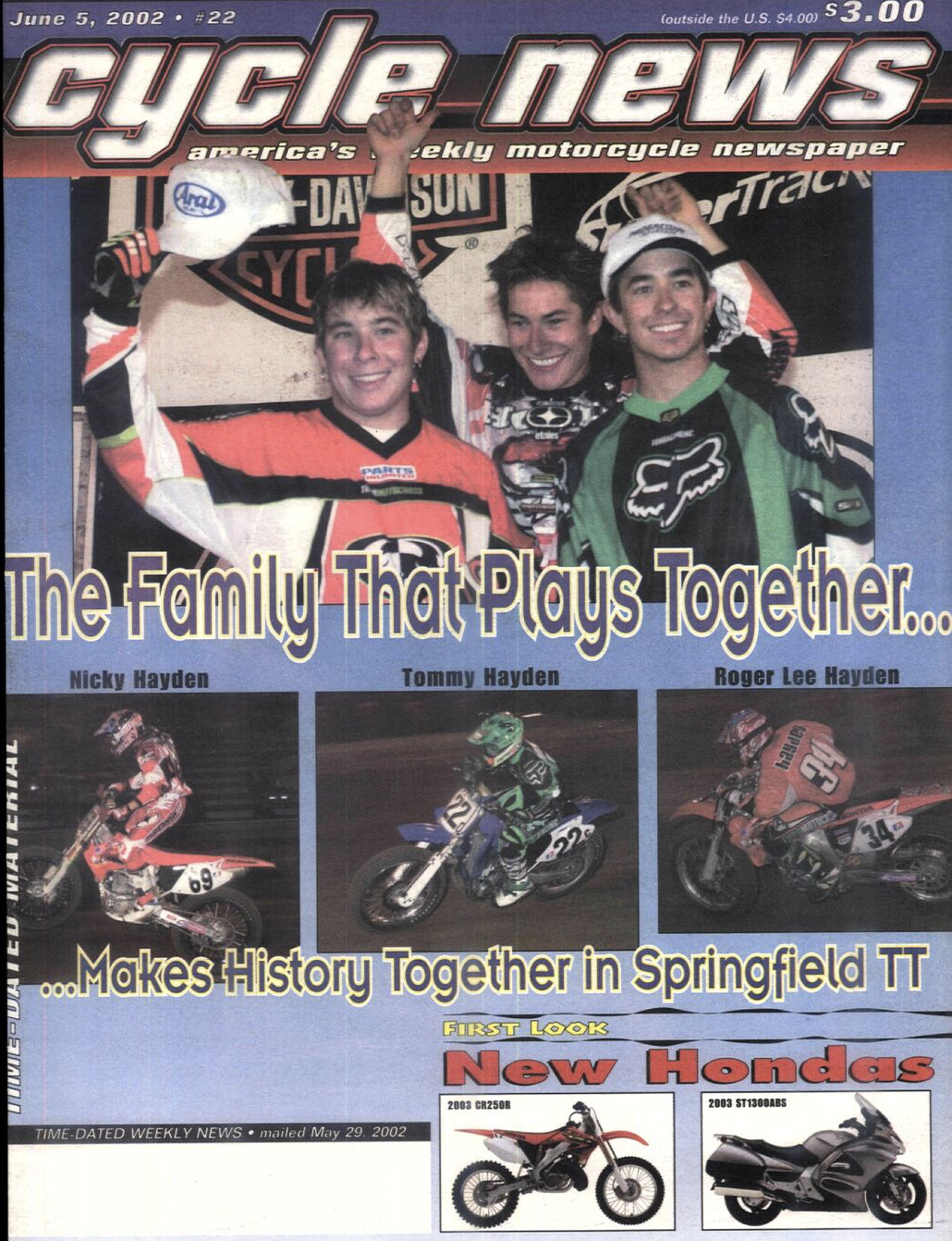 Wrote Lawrence: “Perhaps the proudest moment for Earl and the entire family came in 2002 at the Illinois State Fairgrounds Rodeo Arena, where Nicky, Tommy and Roger finished one-two-three in the AMA Grand National Short Track event. It marked the first time in AMA racing history that three family members filled the podium at an AMA Grand National event.”
