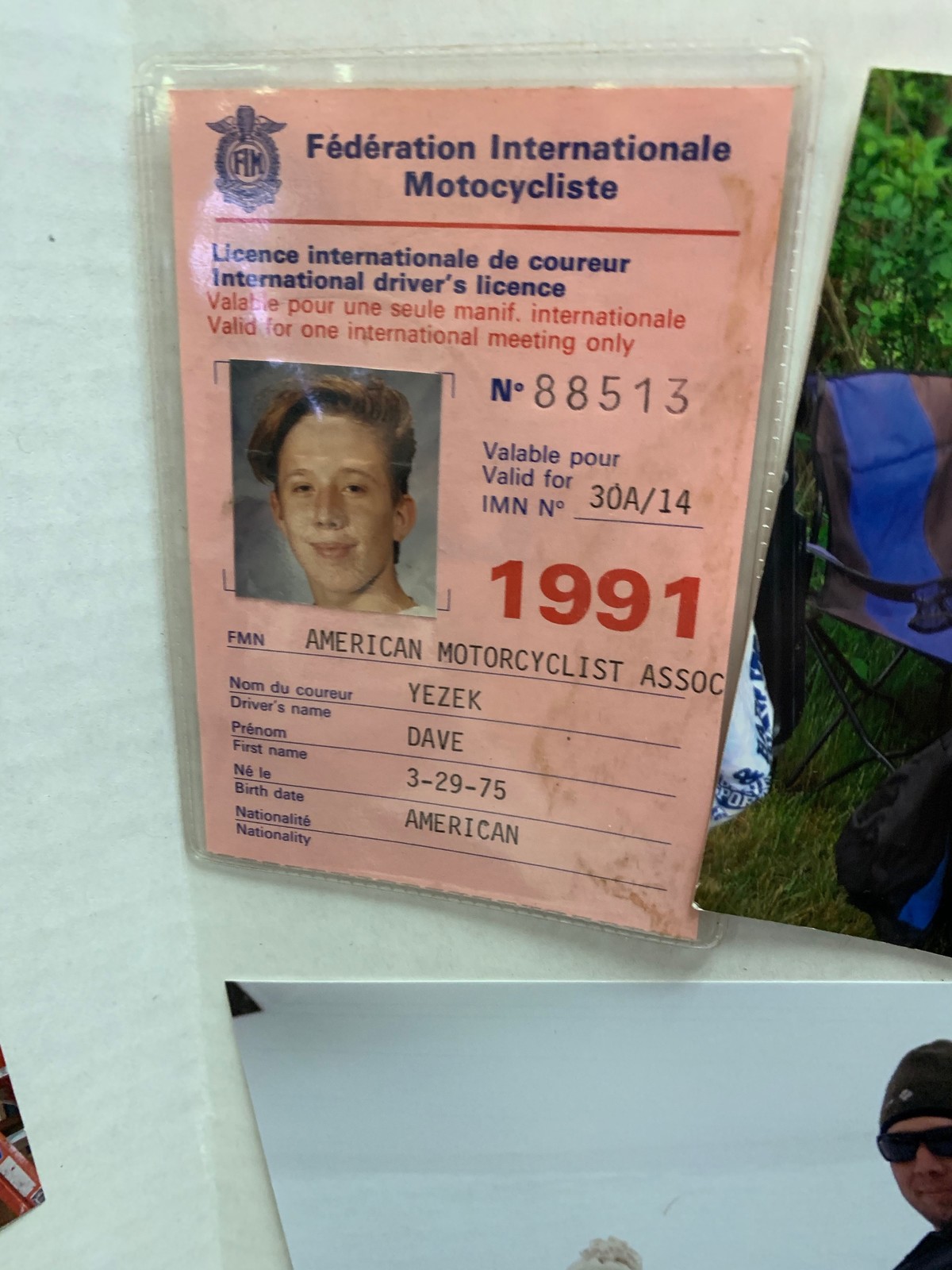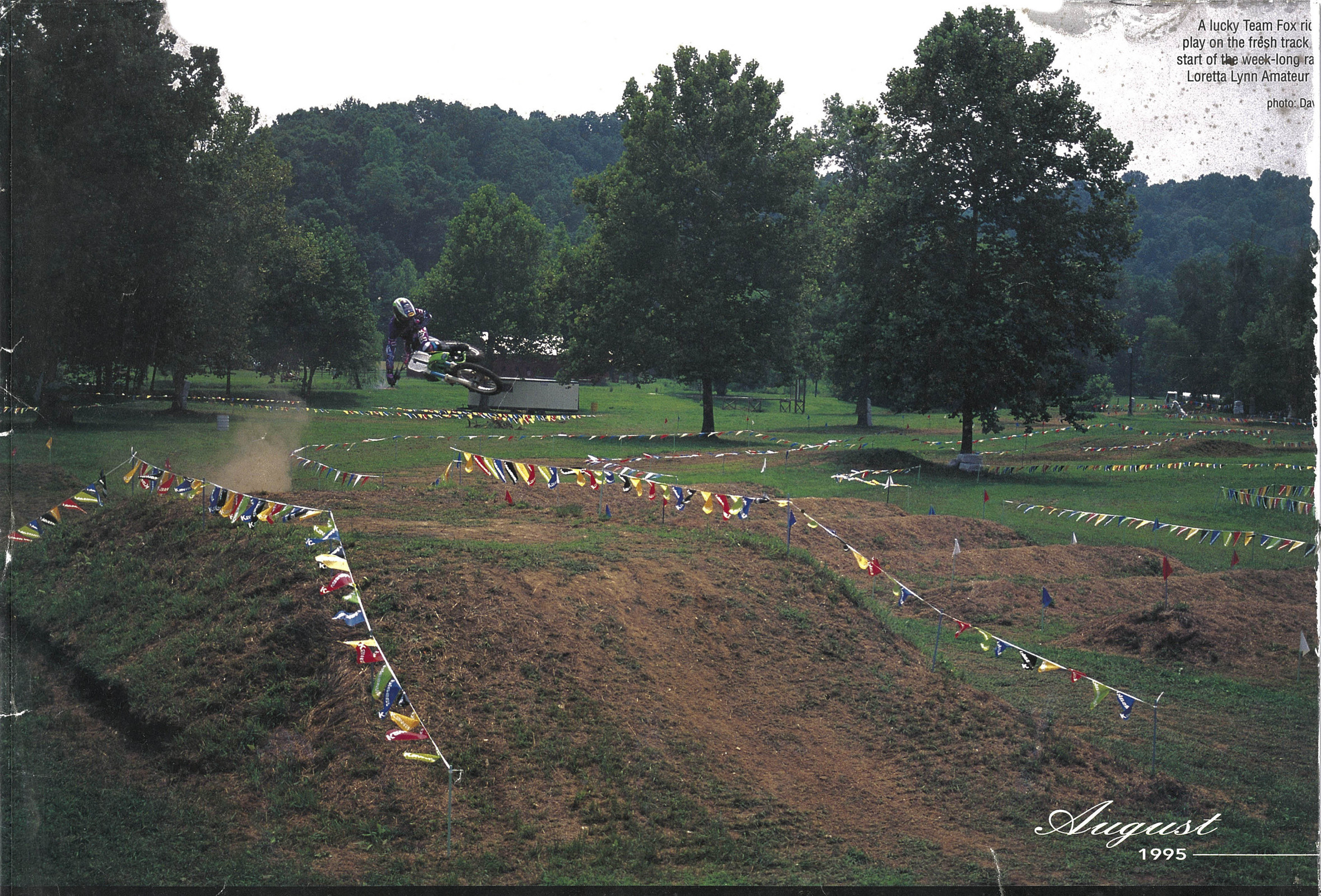 When we first reported Davey's passing in Racerhead #47 I wrote about the time he got to go ride at Loretta Lynn's when the track was still covered with grass and awaiting the tractors, just before all the families started pulling in for the big AMA Amateur National Motocross Championships there. The shoot was part of Fox Racing's "Dream On" campaign, and it eventually made the 1995 Fox Racing calendar. Unfortunately, I no longer had the chrome slide, nor did I have a copy of that old calendar to share what the photo actually looked like. But at the celebration of Yezek's life that was held in his hometown of Mt. Pleasant, Pennsylvania, Davey's mom, Mary, and wife, Abby, had laid out a bunch of his old riding gear, number plates, licenses, trophies, and more. They also took a picture frame off the basement wall of the Yezek family home—it was the August 1995 Fox Racing calendar page. After we cut the grass out on the track and put up some banners for contrast, he geared up, got on his KX125, and did a dozen passes over the infield tabletop. This is the one that made the calendar. Afterward, with Davey still in his Fox gear, we rolled up the banners, pulled out the wooden stakes, and watched as the tractors came out to get the place race-ready. It was a really good day.