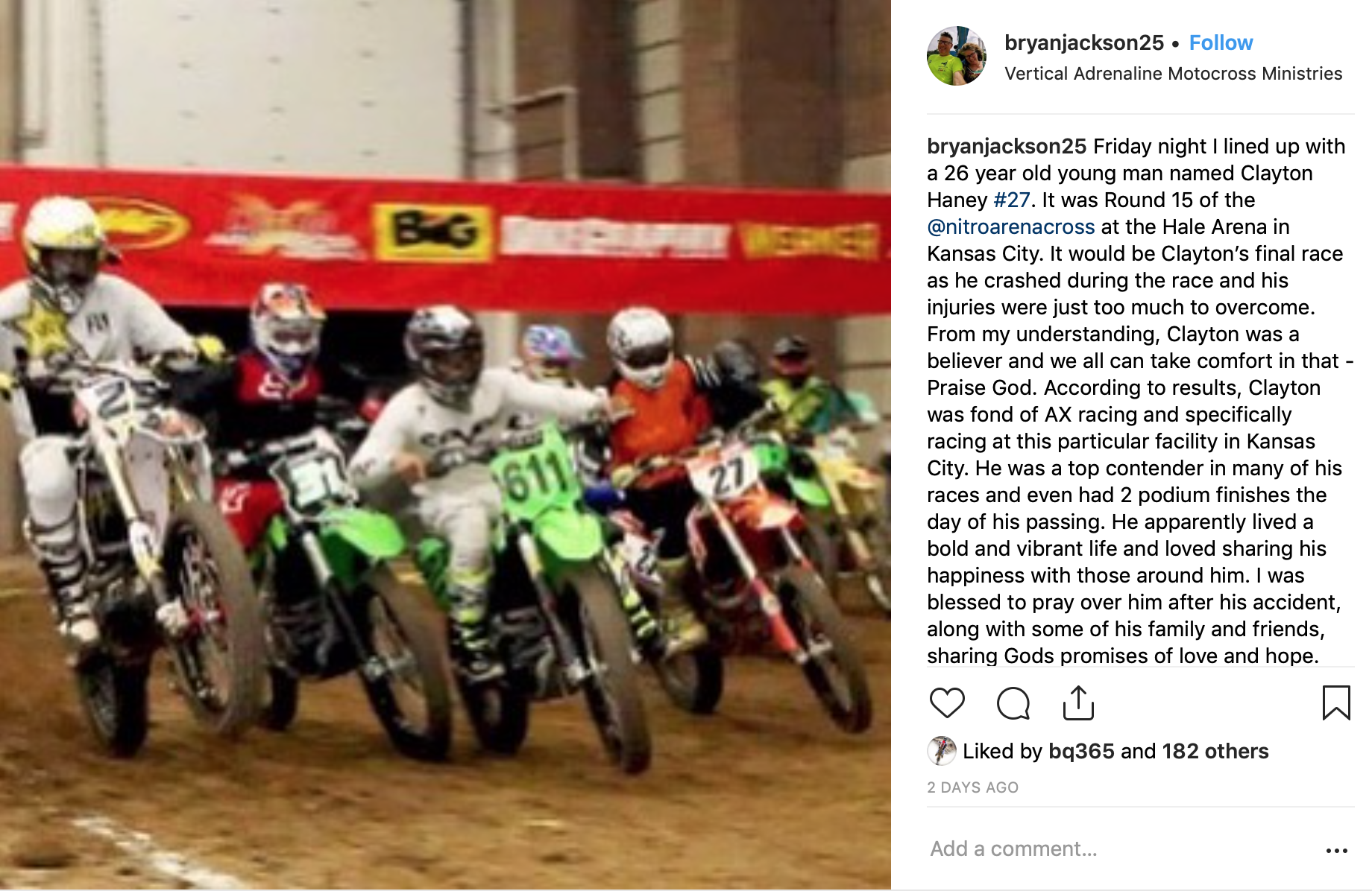 Another competitor in the January race was Bryan Jackson, who acts as the pastor for the Nitro AX Nationals. He posted on Instagram (@bryanjackson25): "Friday night I lined up with a 26-year-old young man named Clayton Haney #27... He crashed during the race and his injuries were just too much to overcome. From my understanding, Clayton was a believer and we all can take comfort in that - Praise God.... He was a top contender in many of his races and even had two podium finishes the day of his passing. He apparently lived a bold and vibrant life and loved sharing his happiness with those around him. I was blessed to pray over him after his accident, along with some of his family and friends, sharing God's promises of love and hope. The riders Chapel Service on Friday morning, before the accident, was a reminder to all attending that life is indeed precious - and that we all will enter eternity at some point. Jesus is our only guarantee that we will not be separated from God when that time comes."