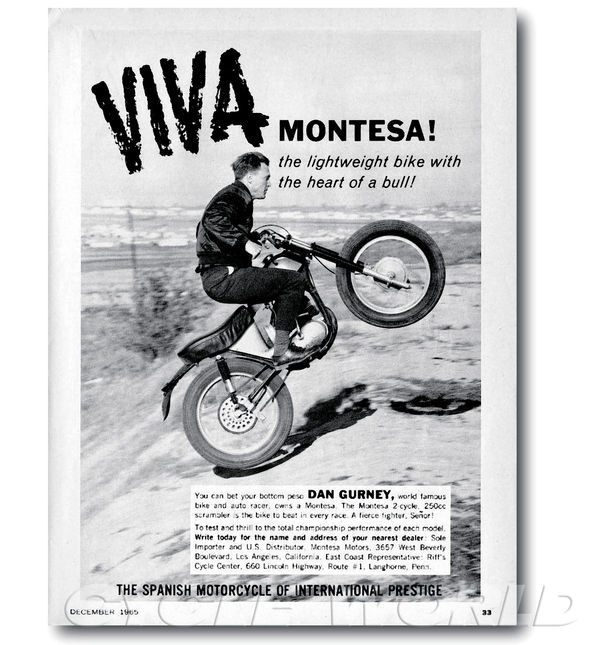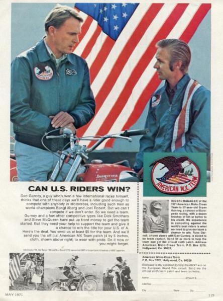 Gurney was also a businessman and a motorcycle enthusiast. In fact, for a time he was the VP for the U.S. distributor for the Spanish dirt bike brand Montesa, as well as one of the first financial backers for a Team USA effort at the Motocross and Trophee des Nations in the late sixties and early seventies. Said Gurney, “Most of us have a feeling in our hearts that Americans can match the best racers Europe has to offer. If we can’t do it ourselves, at least we can see fellows we know doing it."