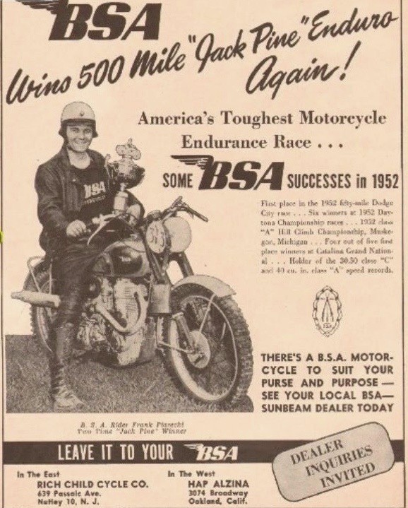 Frank Piasecki Sr. came home to Toledo, Ohio, after fighting in World War II as a sharpshooter in the U.S. Marine Corps in Guam, and then he went back to riding dirt bikes—something he'd been doing since he was 13 years old. He soon ventured into motorcycle racing and ended up winning the 1952 Jack Pine Enduro in Michigan, then considered the toughest off-road race in America. He also won an early version of the Alligator Enduro at Daytona Beach, back when it included riding on the beach, the paved roads, the fields, woods, and swamps.