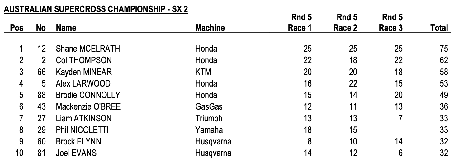 | Shane McElrath (Honda) | AUS-X Open | SX2 |