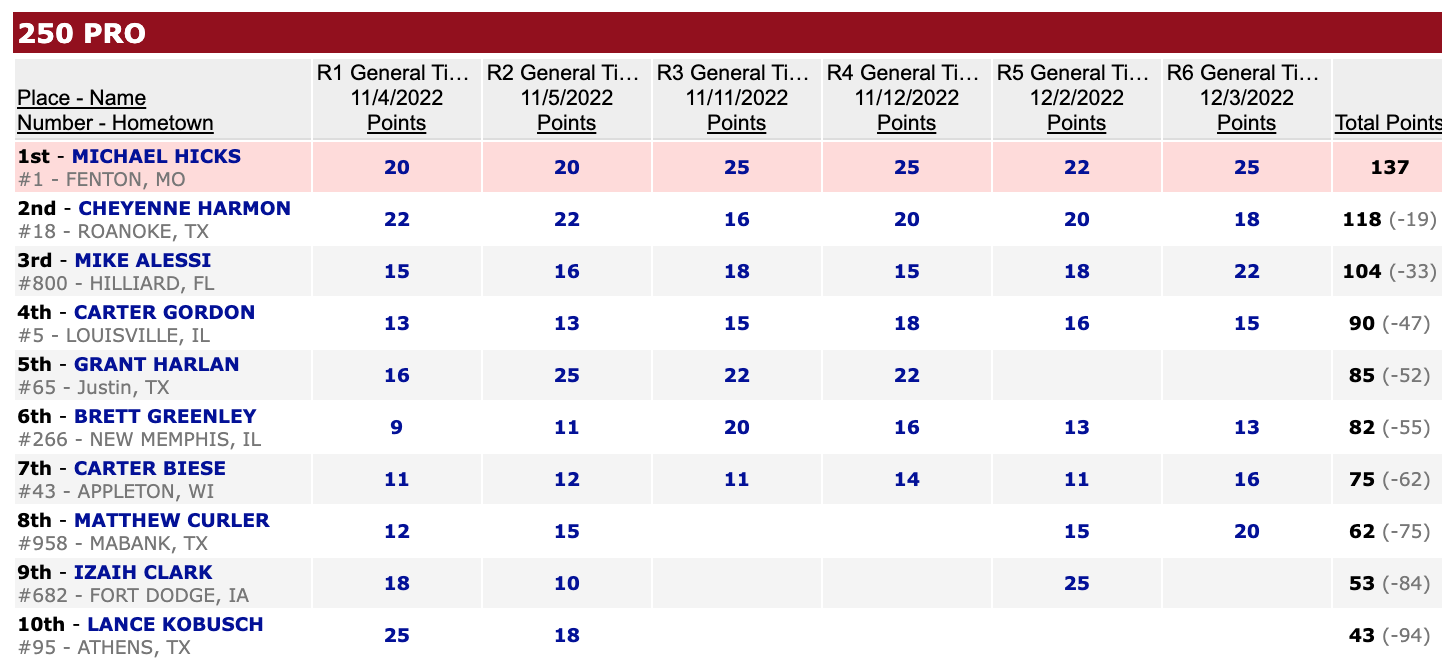 | Michael Hicks (KTM) | Hoosier Arenacross Series | 250 Pro |
