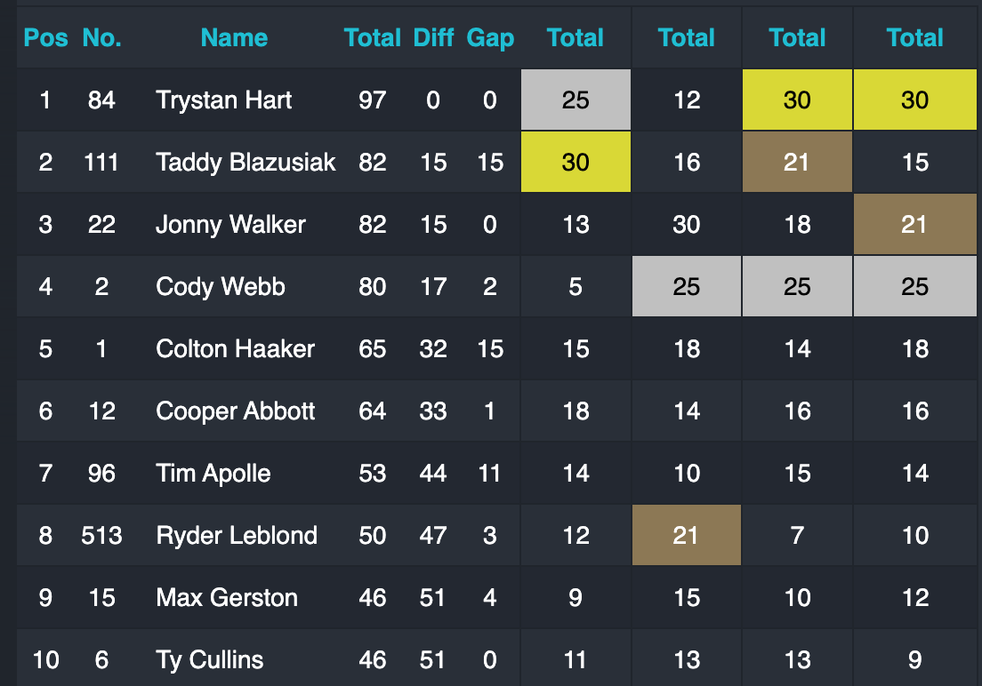 Note: Taddy Blazusuak received a two-position penalty following the third round.