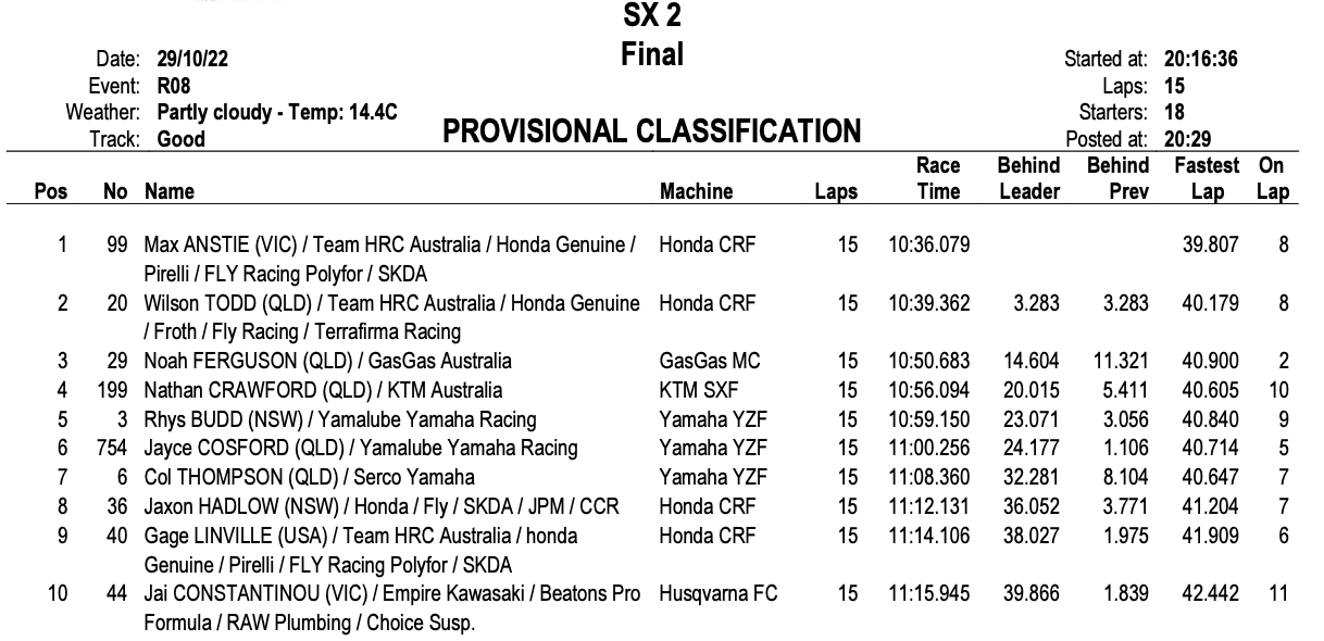| Max Anstie (Honda) | Fox Australian Supercross Championship | SX2 |