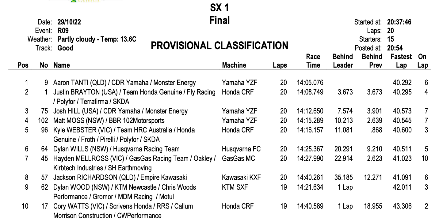 | Aaron Tanti (Yamaha) | Penrite ProMX Championship | MX1 |