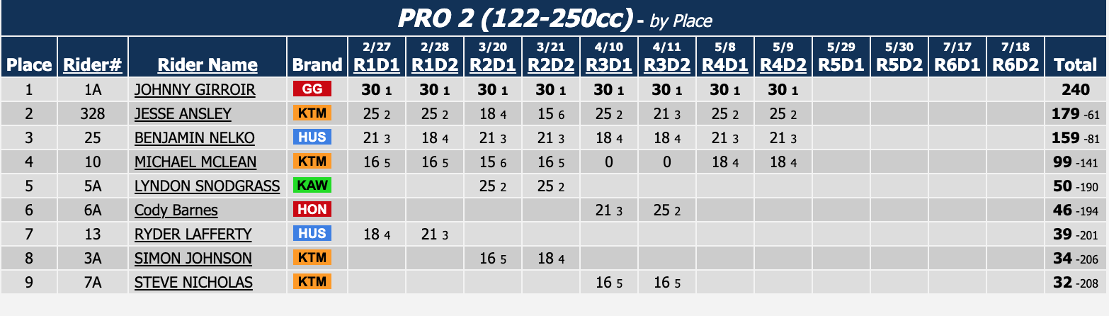 | 5th | Ryder Lafferty | NE Pro1 | Husqvarna | 16 |