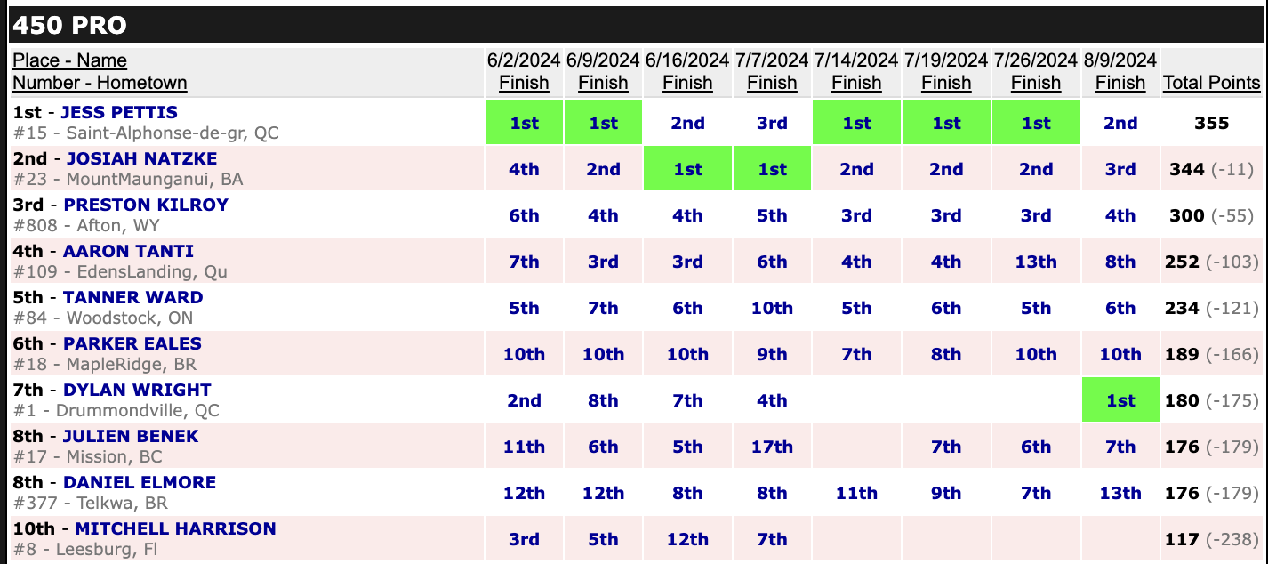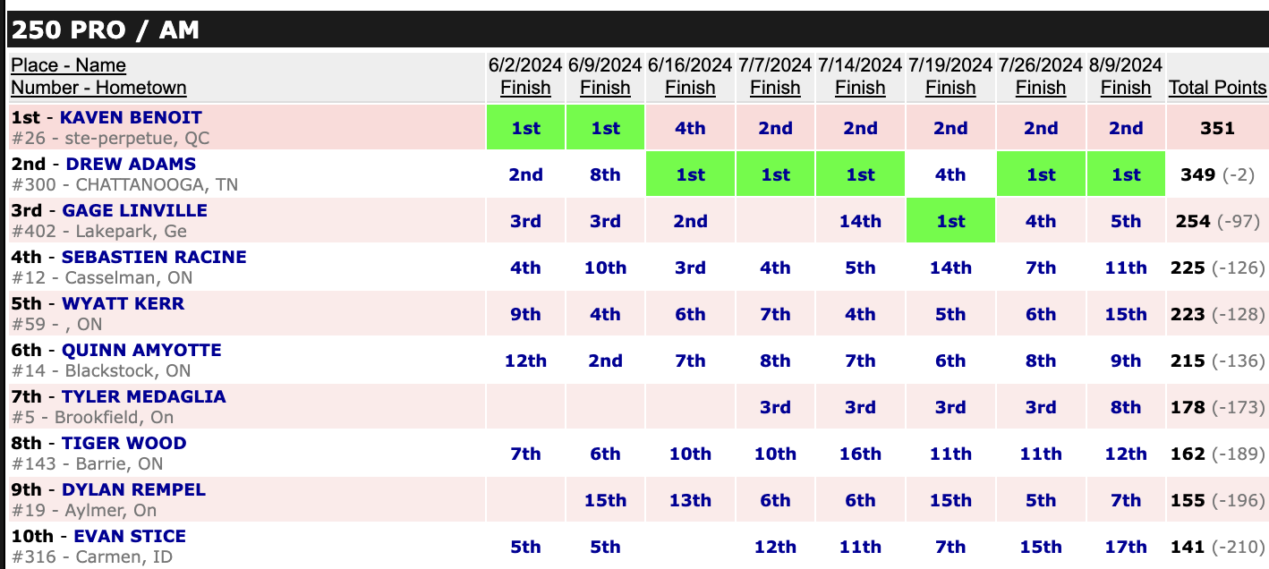 August 10, 2024| Rider | Hometown | Motos | Bike | |