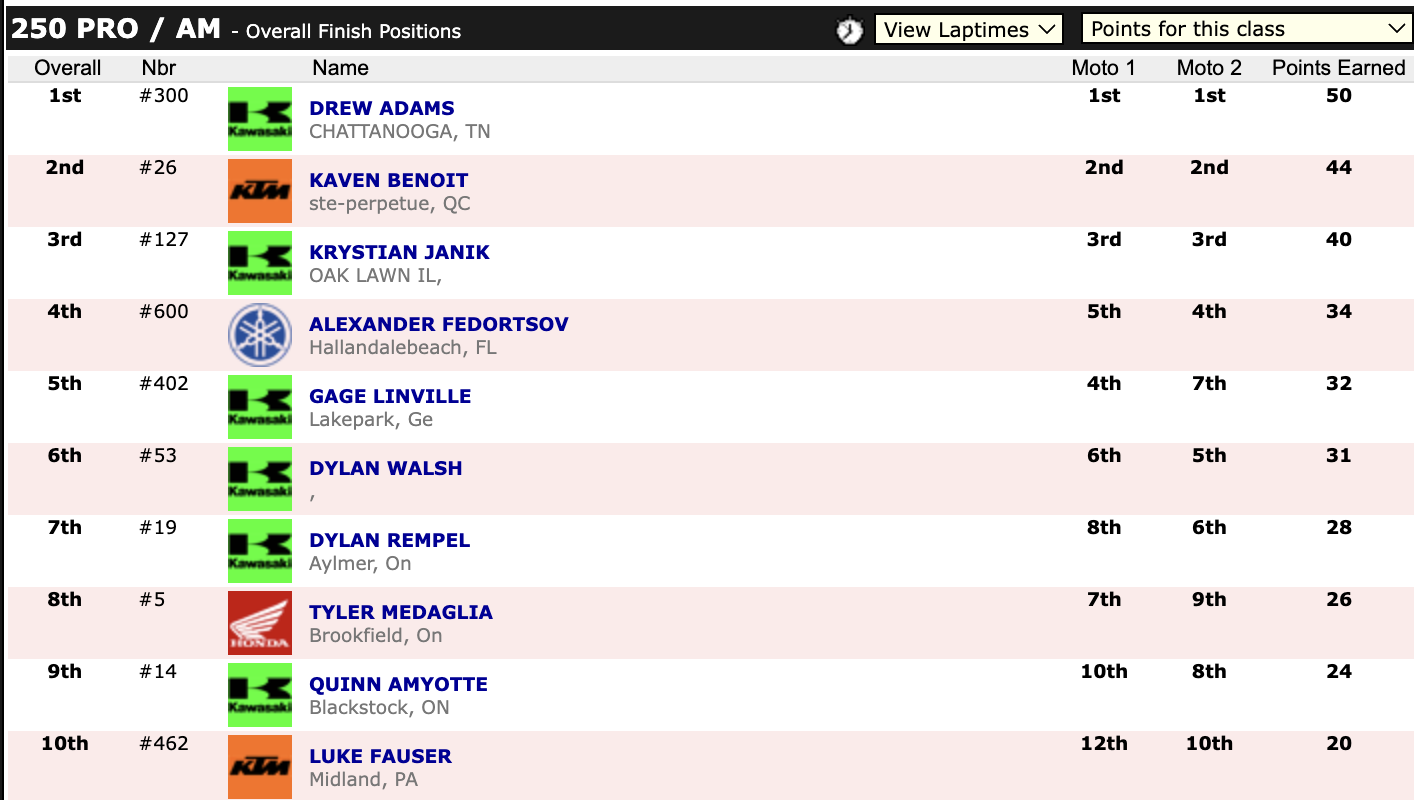| Kaven Benoit (KTM) | CanadianTriple Crown (Motocross) | 250 |