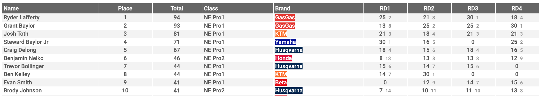 | 9 | Pierce Brown | Sandy, UT | 12 - 9 | GasGas MC 250F |