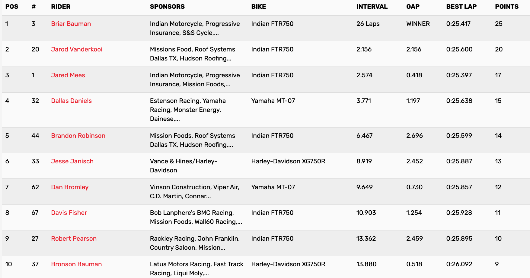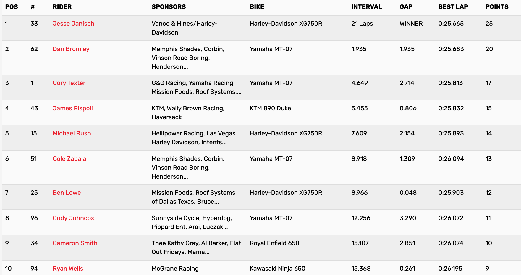 | Kody Kopp (KTM) | American Flat Track | AFT Production Twins |