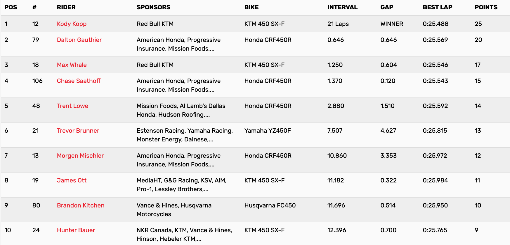 | 8 | Benny Bloss | Oak Grove, MO | 9 - 10 | KTM 450 SX-F |