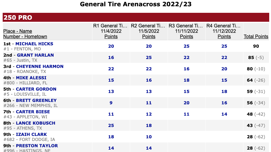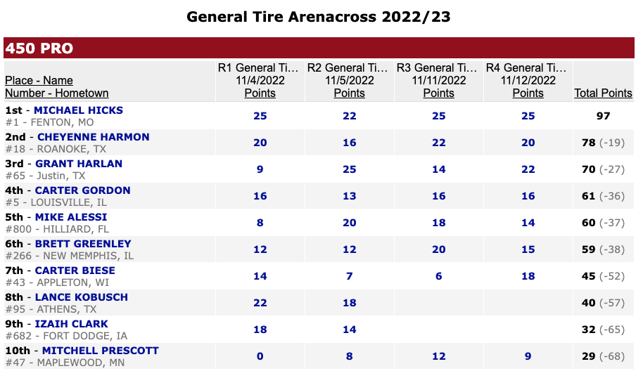 | Michael Hicks (KTM) | Hoosier Arenacross Series | 450 Pro |