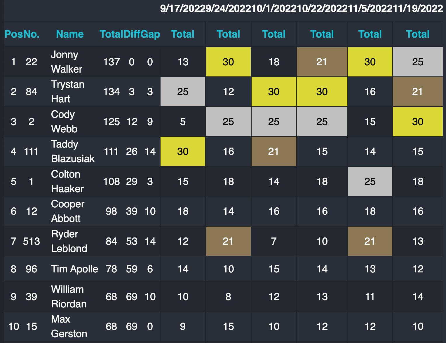 Note: Taddy Blazusuak received a two-position penalty following the third round.